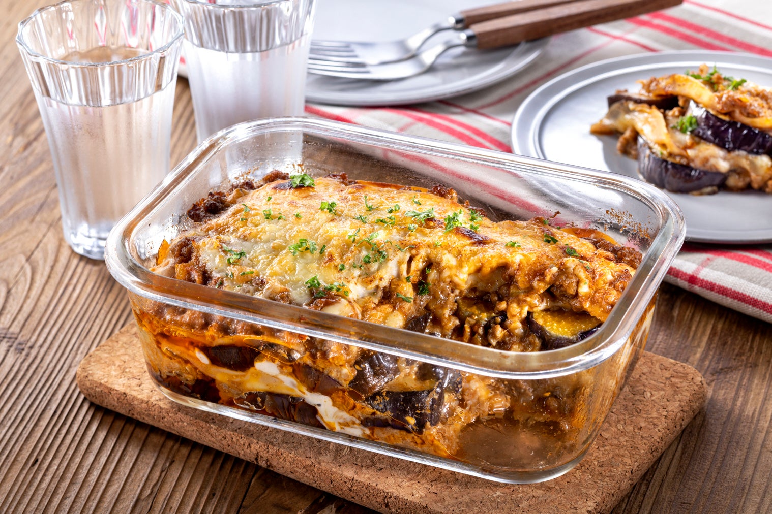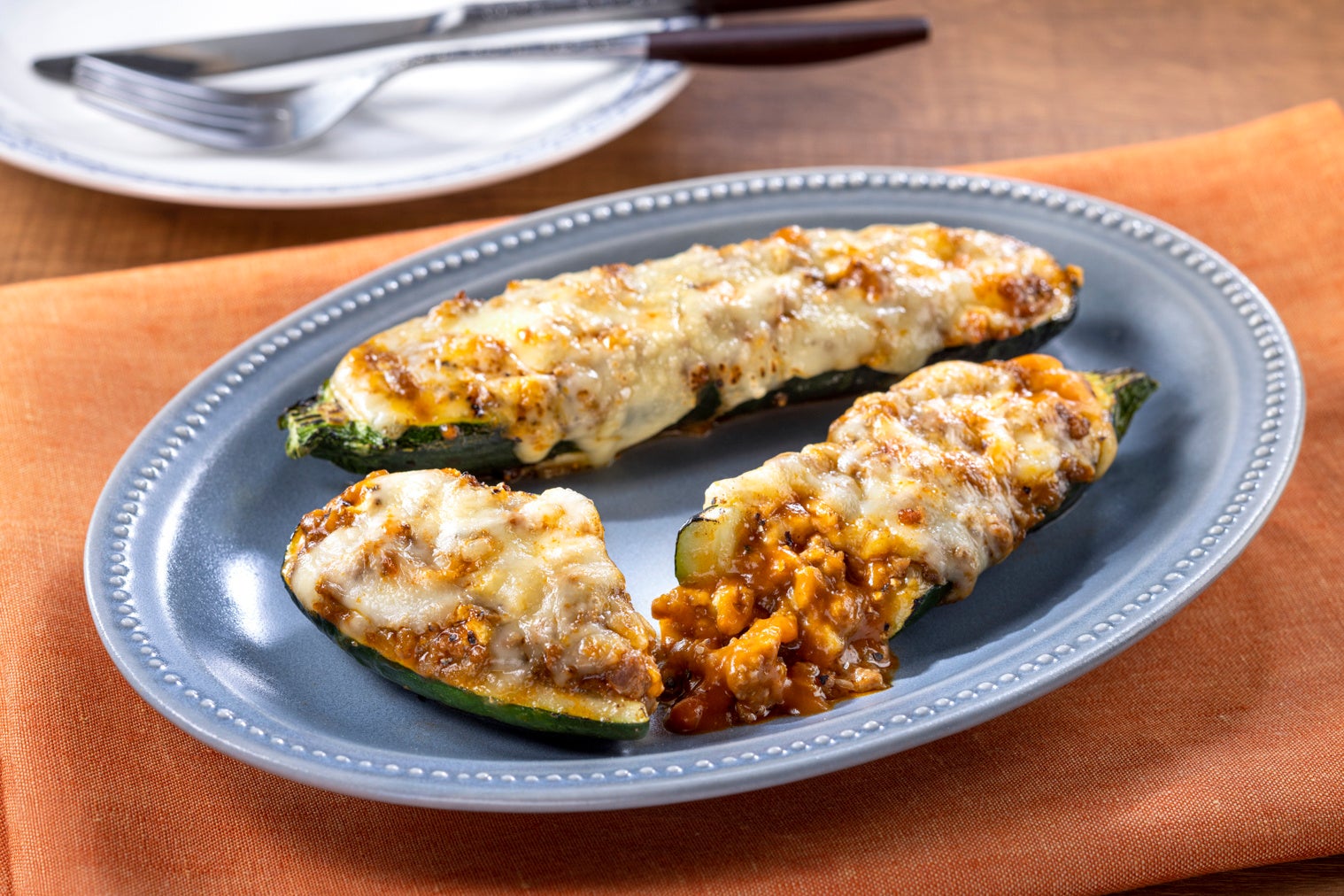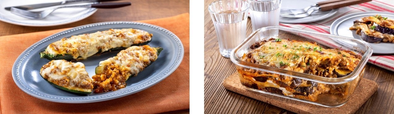 *画像左から、<ボロネーゼハヤシで作るズッキーニボート>、<ボロネーゼハヤシで作るナスのラザニア>
