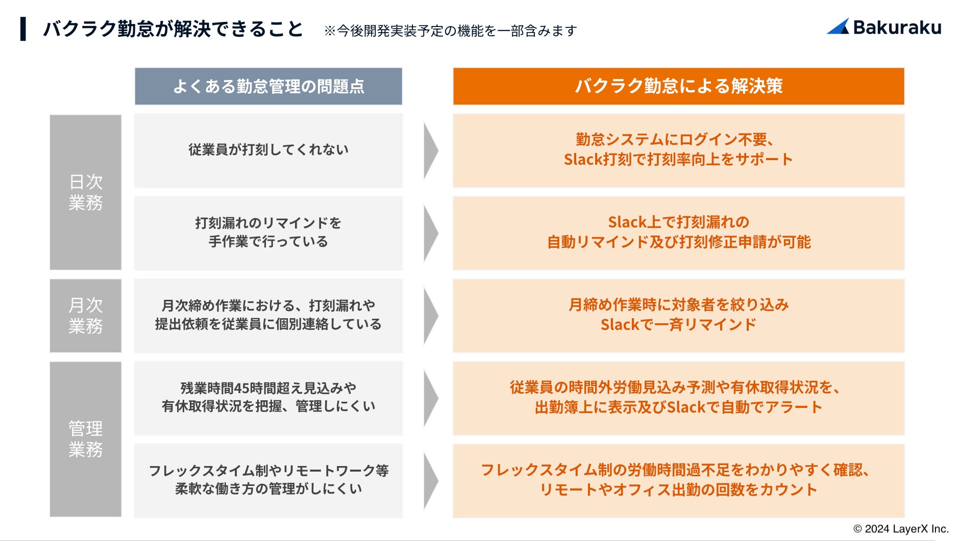 すべての経済活動のデジタル化を目指す株式会社LayerXは、勤怠管理サービス「バクラク勤怠」の提供を開始しました。本日より一部のお客様向けに先行提供を開始し、2025年1月以降、全てのお客様を対象にサービスの提供範囲を拡大してまいります。