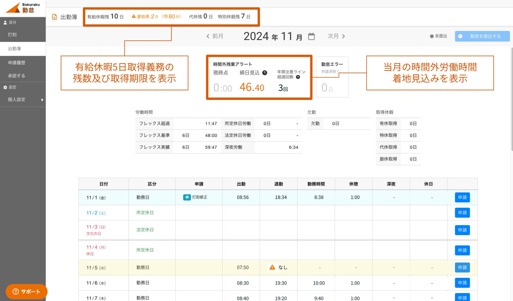 バクラク勤怠は、勤務実態や必要な申請状況をわかりやすく把握できるサービスです。従業員は労働時間や休暇取得を自己管理しやすくなり、管理職は時間外労働の予測値や有給休暇の取得状況を一覧で確認することで、過重労働や有給休暇の未消化を早期に検知できます。