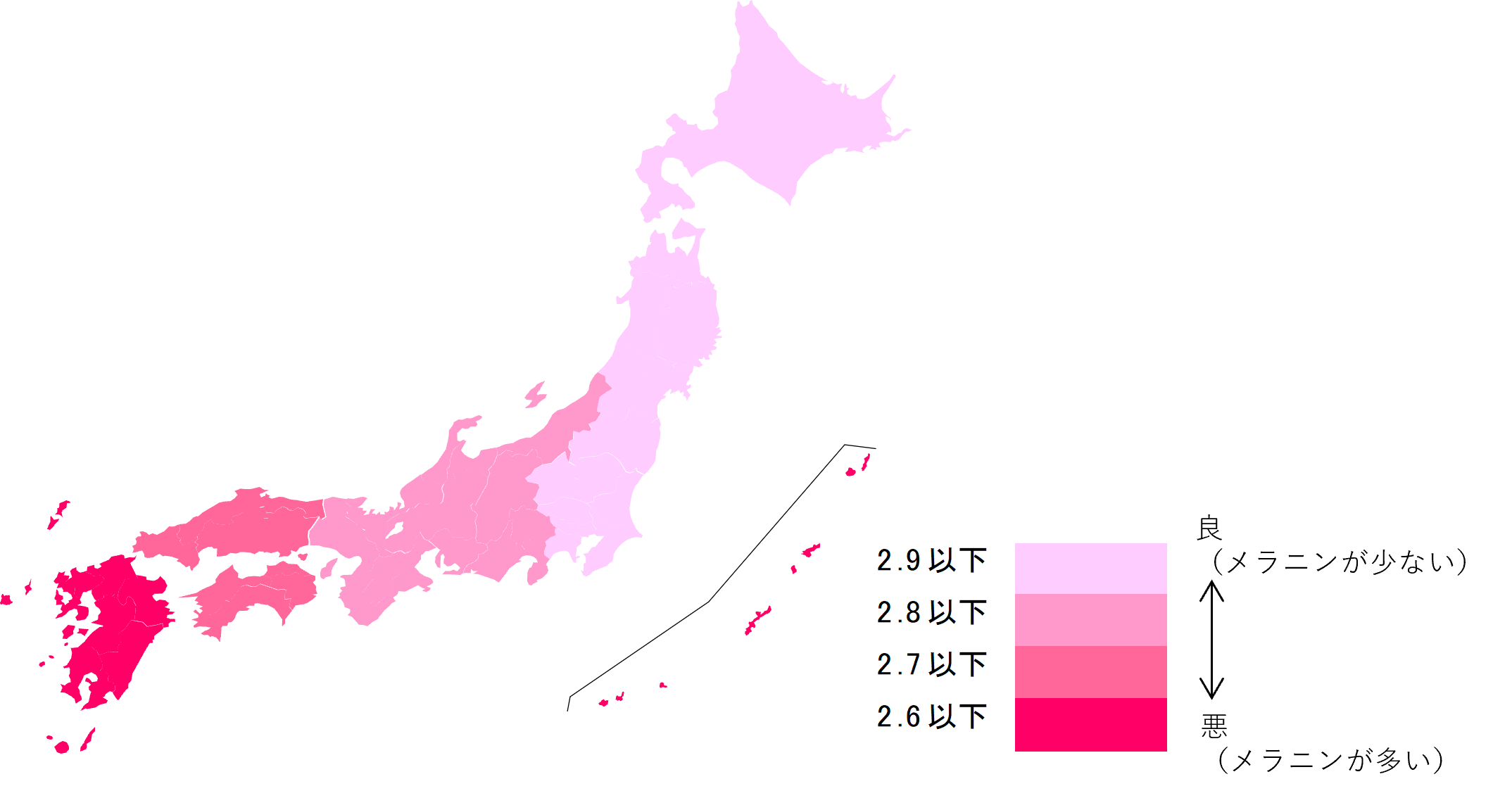 シミの原因となるメラニン量を分析したところ、日本列島の東側のスコアが高く(メラニンが少なく)、西にいくにつれて低く(メラニンが多く)なる『東高西低』の傾向。