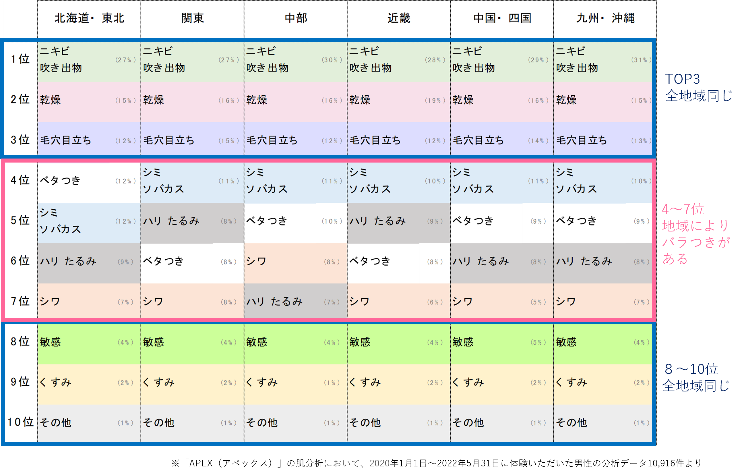 【アペックス肌分析データ】男性肌に関する地域特性 肌色に関係するメラニン(レス)スコアは東高西低 肌悩みTOP3は全国共通