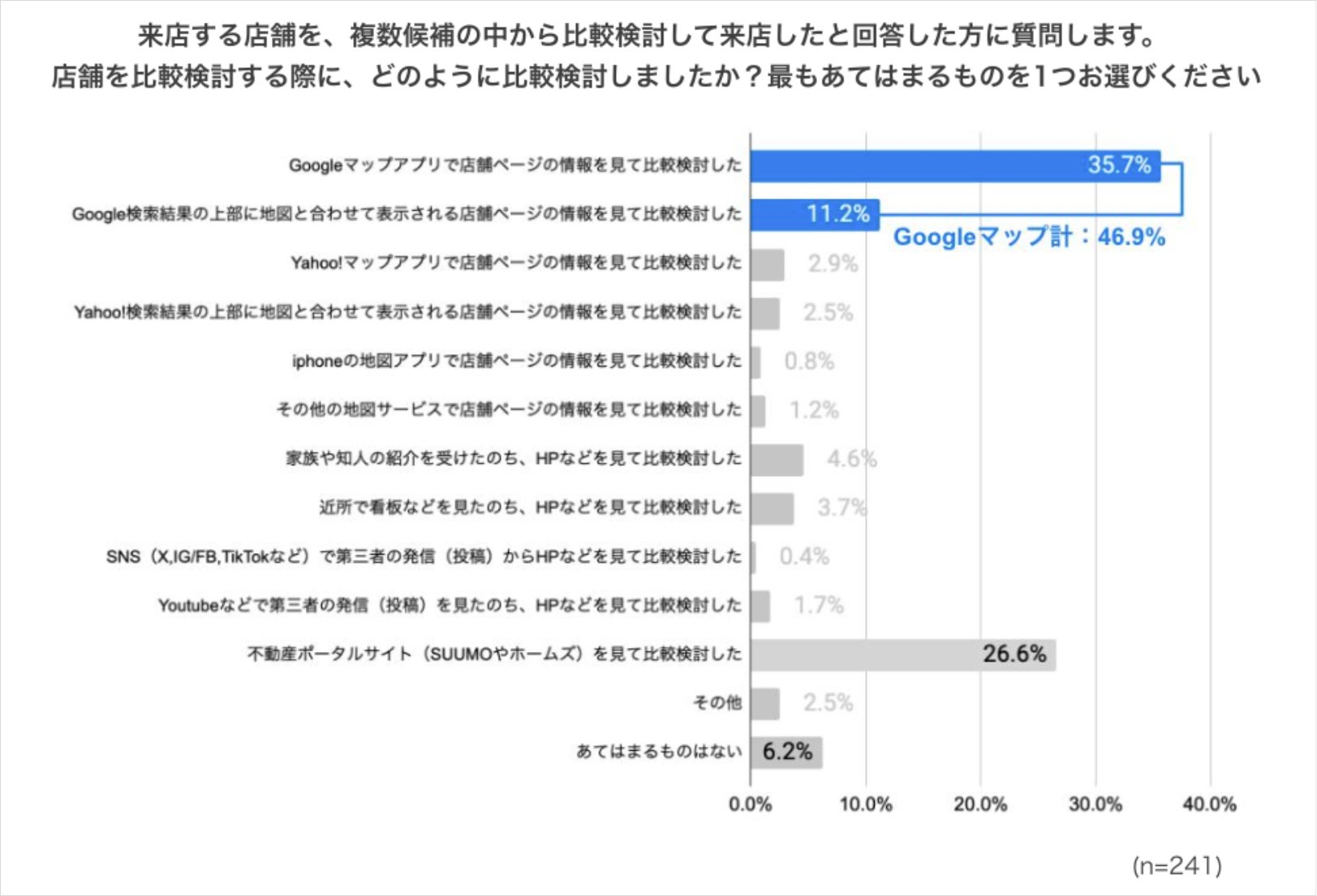 結果として、「Googleマップアプリで店舗ページの情報を見て比較検討した」が約35.7%、「Google検索結果の上部に地図と合わせて表示される店舗ページの情報を見て比較検討した」が約11.2%と、Googleマップの情報を見て比較検討した方が約46.9%と全体の約半数を占めていることがわかりました。