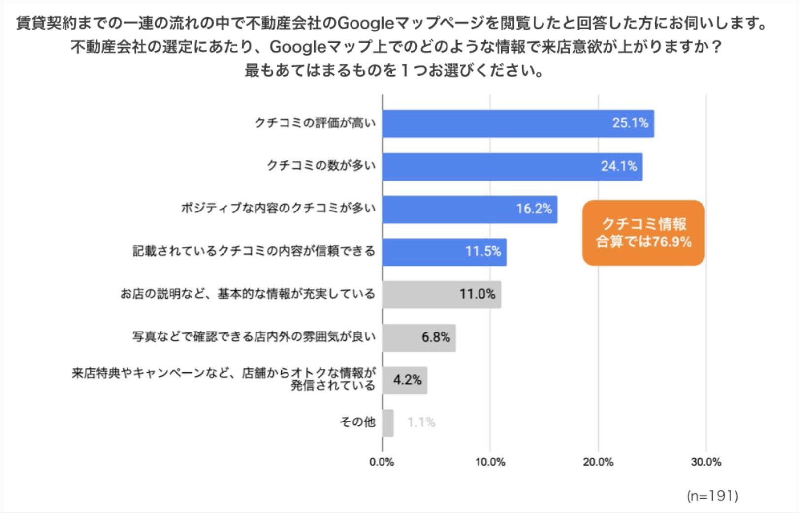 結果として、「クチコミの評価が高い」「クチコミの数が多い」「ポジティブな内容のクチコミが多い」「記載されているクチコミの内容が信頼できる」というクチコミ情報を合わせると、来店意欲が上がる割合が約76.9%にのぼりました。