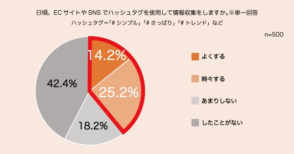 ECサイトやSNSでハッシュタグを使用した情報収集を【よくする】【時々する】を選択した人は約4割となり、ハッシュタグを使用した情報収集は浸透しきっていないことがわかりました。