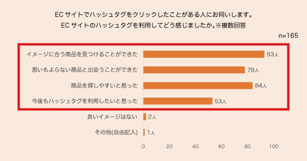 ハッシュタグをクリックしたことがある人の半数以上が「イメージに合う商品を見つけることができた」「商品を探しやすいと思った」など良いイメージを抱いており、ハッシュタグがECサイトの満足度向上に寄与し、より快適な検索体験を提供する機能であることがわかりました。