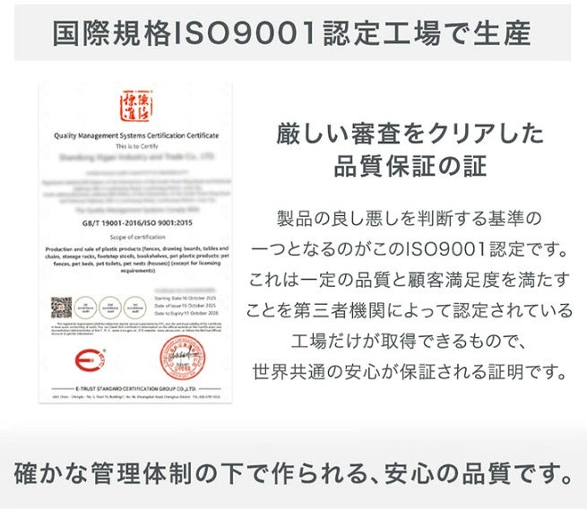 また、本製品は大切なわんちゃんのためとなる製品なので、より安心してご使用いただけるよう品質にもこだわっています。製品の良し悪しを判断する基準の一つとなるのがISO9001認定です。これは一定の品質と顧客満足度を満たすことを第三者機関によって認定されている工場だけが取得できるもので、世界共通の安心が保証される証明です。本製品はそのISO9001認定工場で生産しています。