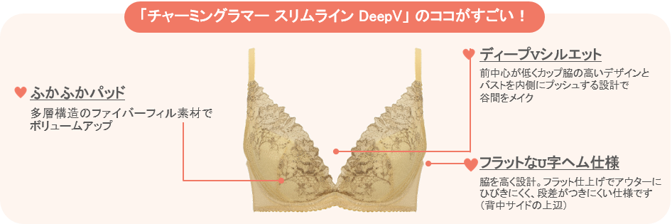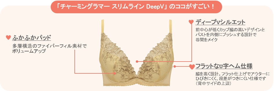 「チャーミングラマー スリムライン DeepV」は、360°パーフェクトシルエット自然にバストを整えながら脇すっきり! 注目フィット「ナチュラルスリムブラ」も