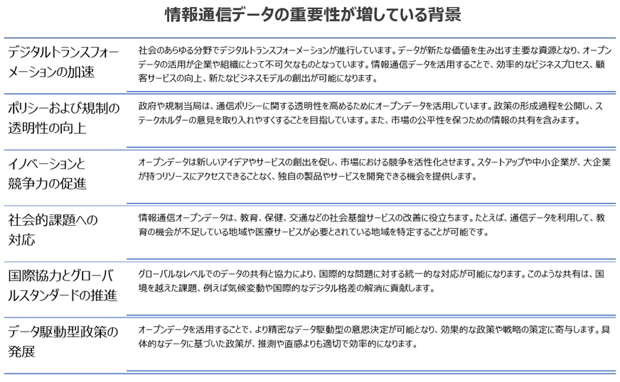 これらの背景要因は、情報通信分野におけるオープンデータの重要性を高め、経済、社会、政治の各分野でのその役割を果たします。オープンデータは多岐にわたる利益を提供し、持続可能な発展の促進に寄与しています。