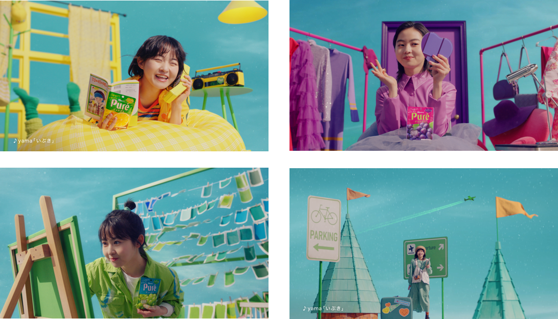 CMでは、レモン、グレープ、マスカットの定番3品との新フレーバー、しゅんわり、青りんごの4つのフレーバーに合わせた4つの「トキメキ」を表現。yamaさんの楽曲に乗せ、伊藤万理華さんが「ピュレグミ」を食べることをきっかけに、大好きなものを友達にシェアすることや新発見に出会う旅、絵を描いて自分の感性を表現すること、メイクやファッションで変化を楽しむことなど、日常の中にあるさまざまなトキメキに気づくことで、自分に自信を持ち、気持ちが彩られる様子を表現しています。今回も楽曲に合わせ伊藤さんが軽やかなダンスを披露しています。
