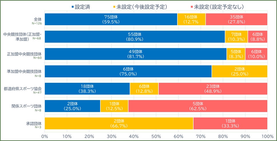また、理事・監事、評議員などの選定における女性の任用増加に関する目標設定状況を見ると、中央競技団体では約8割が設定しているのに対し、都道府県スポーツ協会では約4割にとどまり、さらなる取り組みが求められます。