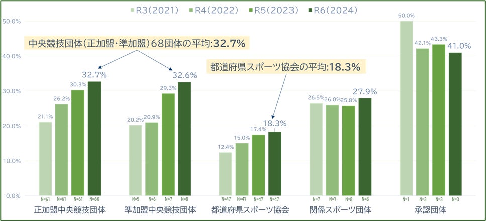 ・中央競技団体の平均(正加盟・準加盟68団体) :32.7% (前年:30.2%) → 2.5ポイント増加