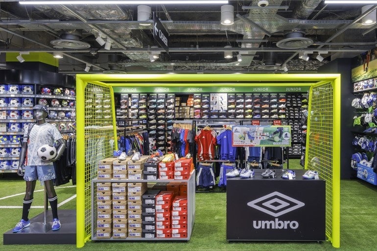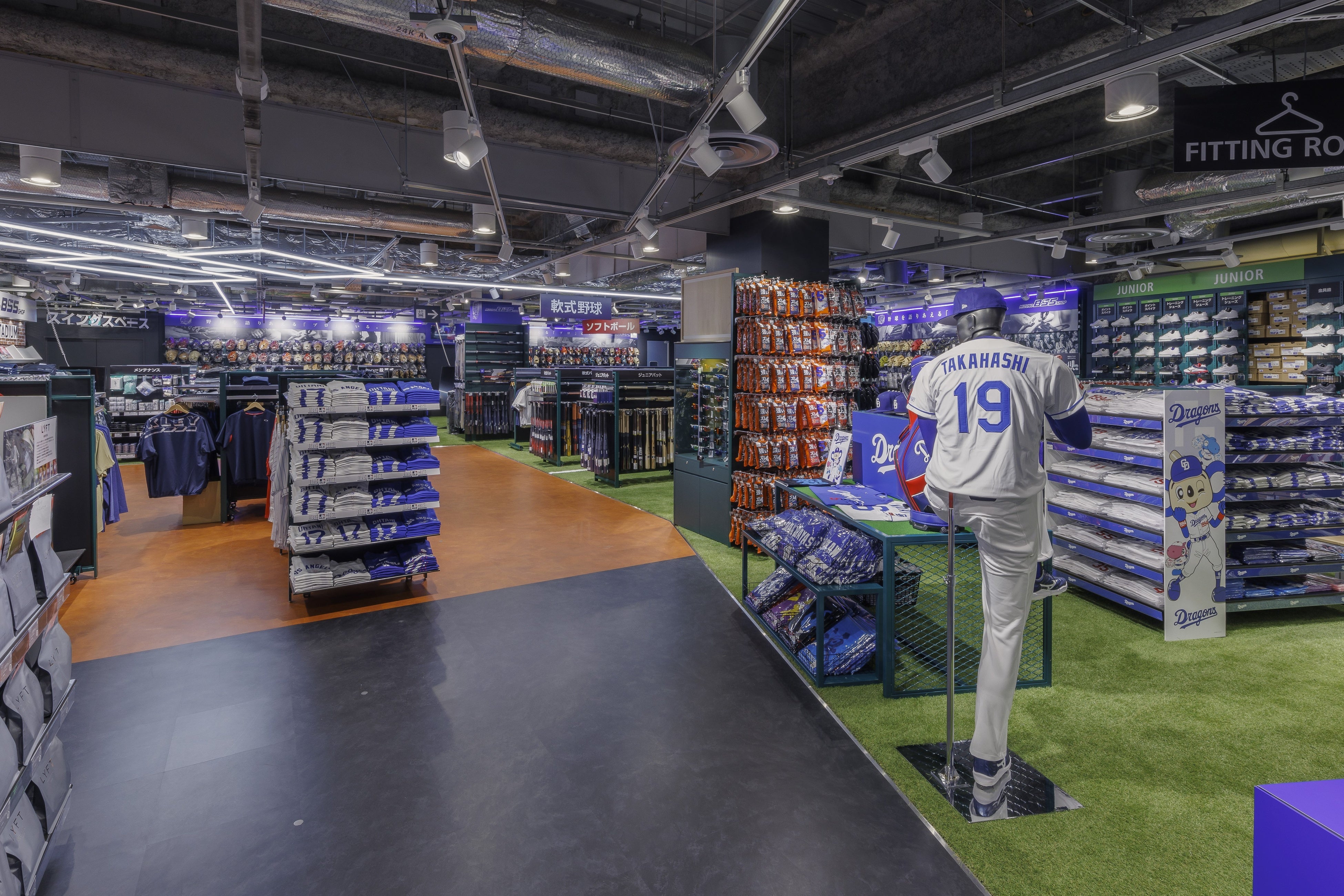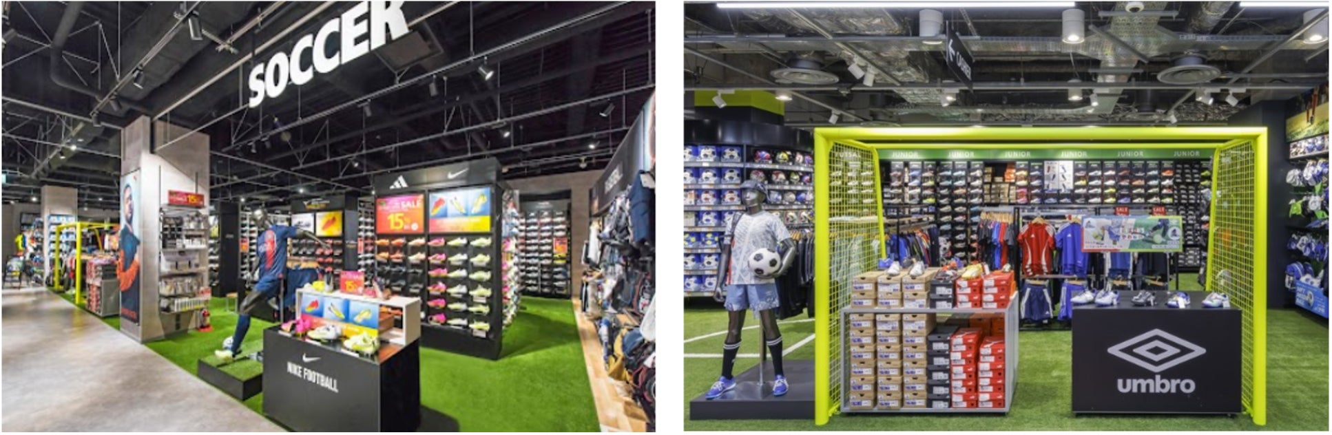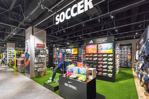 全面に人工芝を敷き詰め、オンピッチを彷彿とさせる売り場にリニューアルしたサッカーコーナー。実際の使用シーンをイメージしながらアイテムを選べるようになりました。商品面では人気のミズノ「モレリア」シリーズをはじめ、アシックス・ナイキ・アディダス・プーマ・アンブロを中心に、レベル問わず豊富な展開。さらに、最短30分で自分だけのユニフォームなどを制作できる圧着サービスを導入し、売り場もサービスも「リアル体験型」に生まれ変わりました。
