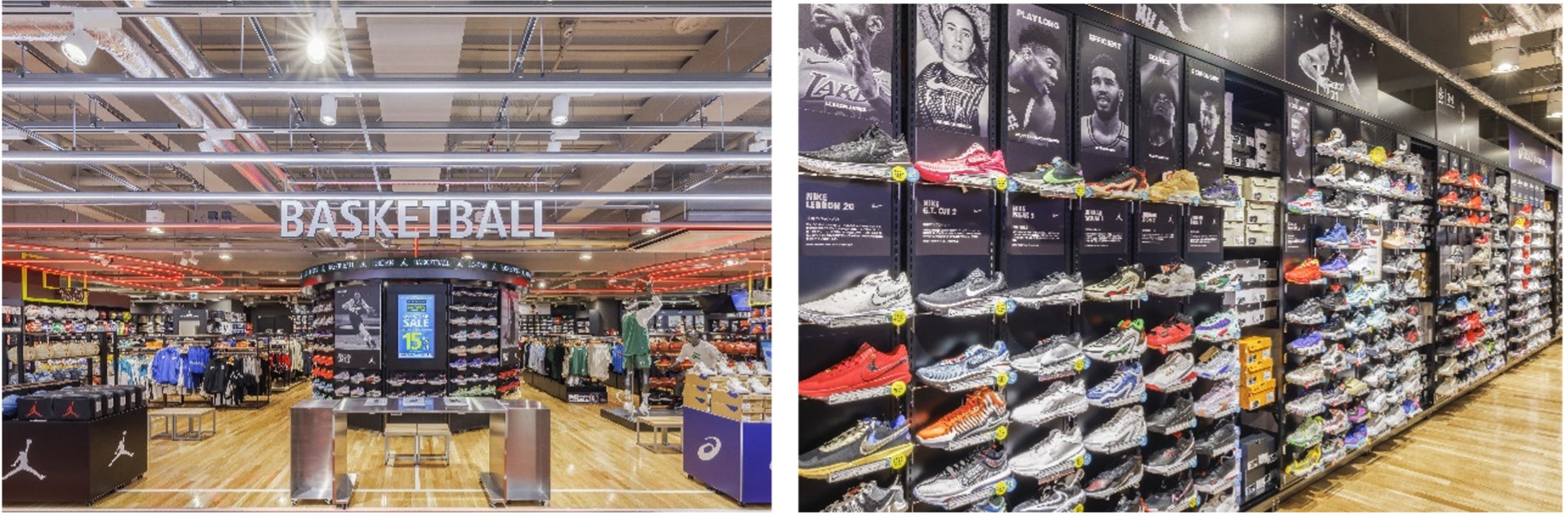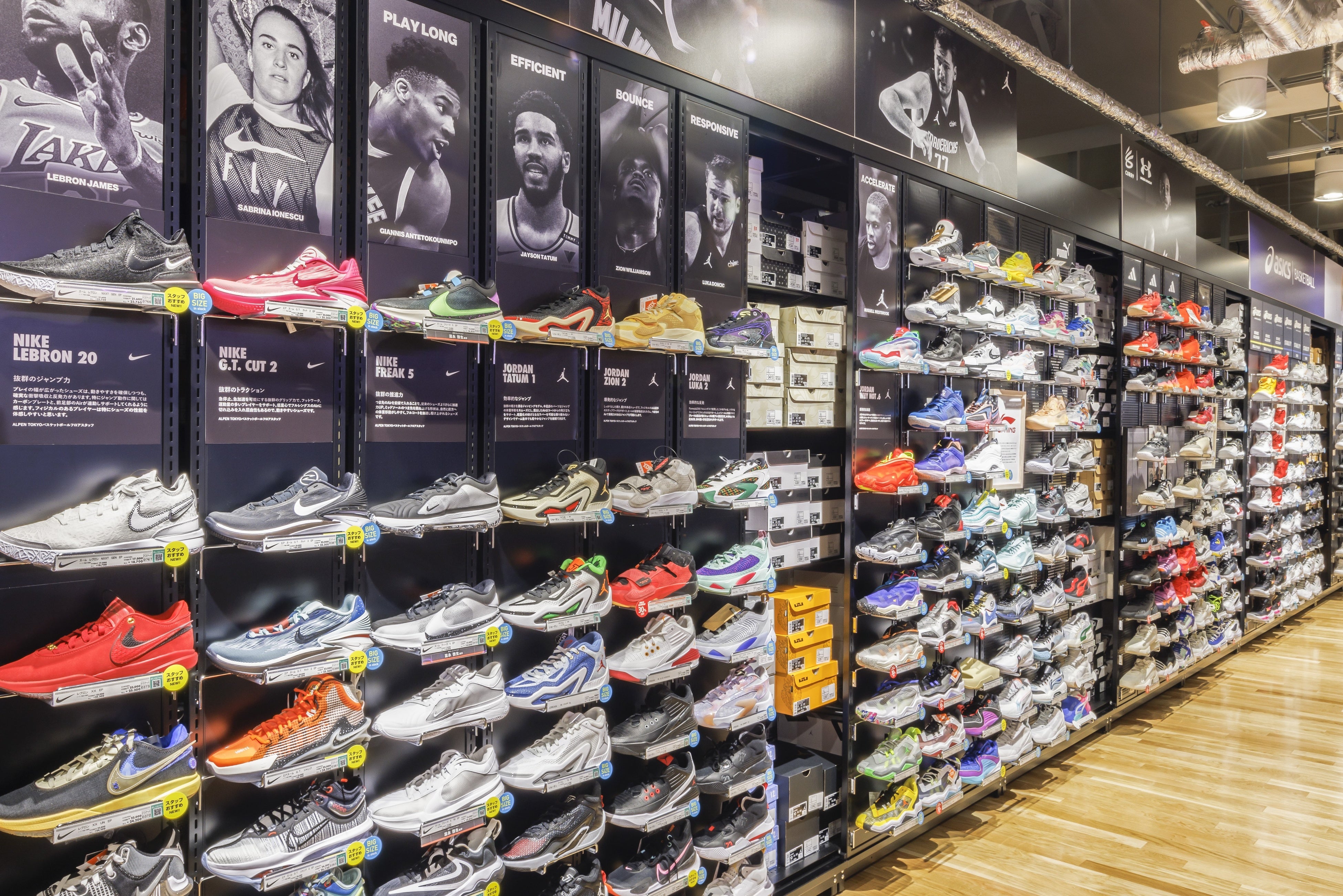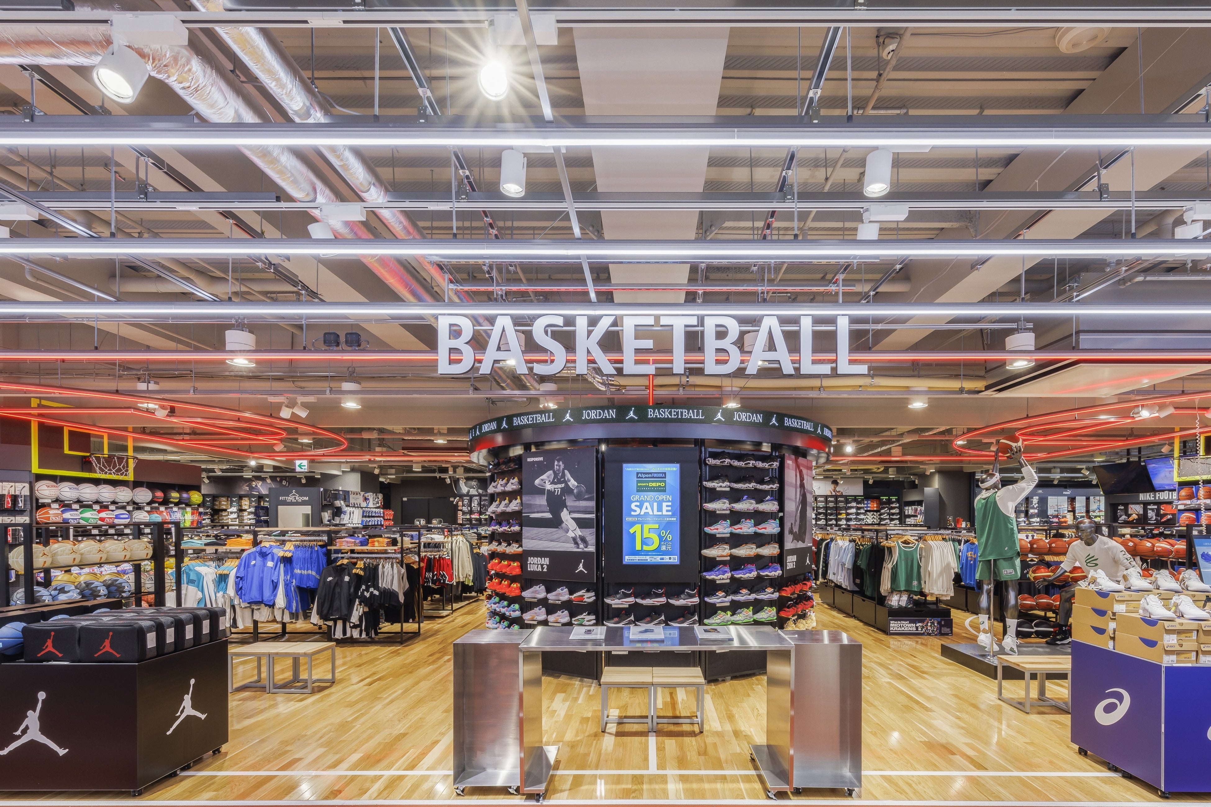 ジョーダンブランドの特設売り場も展開し、圧倒的な品揃えを楽しんでいただける空間にパワーアップ。売り場のレイアウトも、バスケットコートの臨場感を視覚的にも体感できる演出を行なっています。