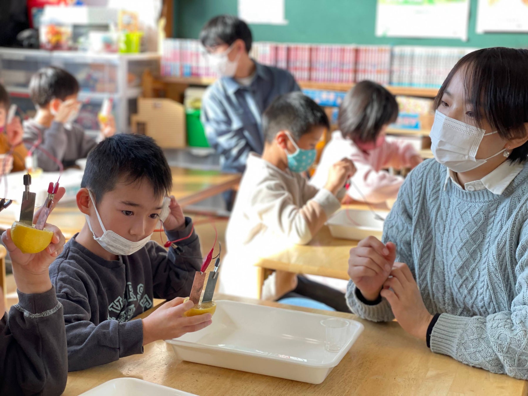 まずはエネルギーについて考えてもらうため、児童たち自身で「レモン電池」を作ってみました。レモン電池の基本の仕組みは、乾電池と同じです。レモンに2種類の金属板を差し込んで導線をつなぐと、エネルギーが発生します。