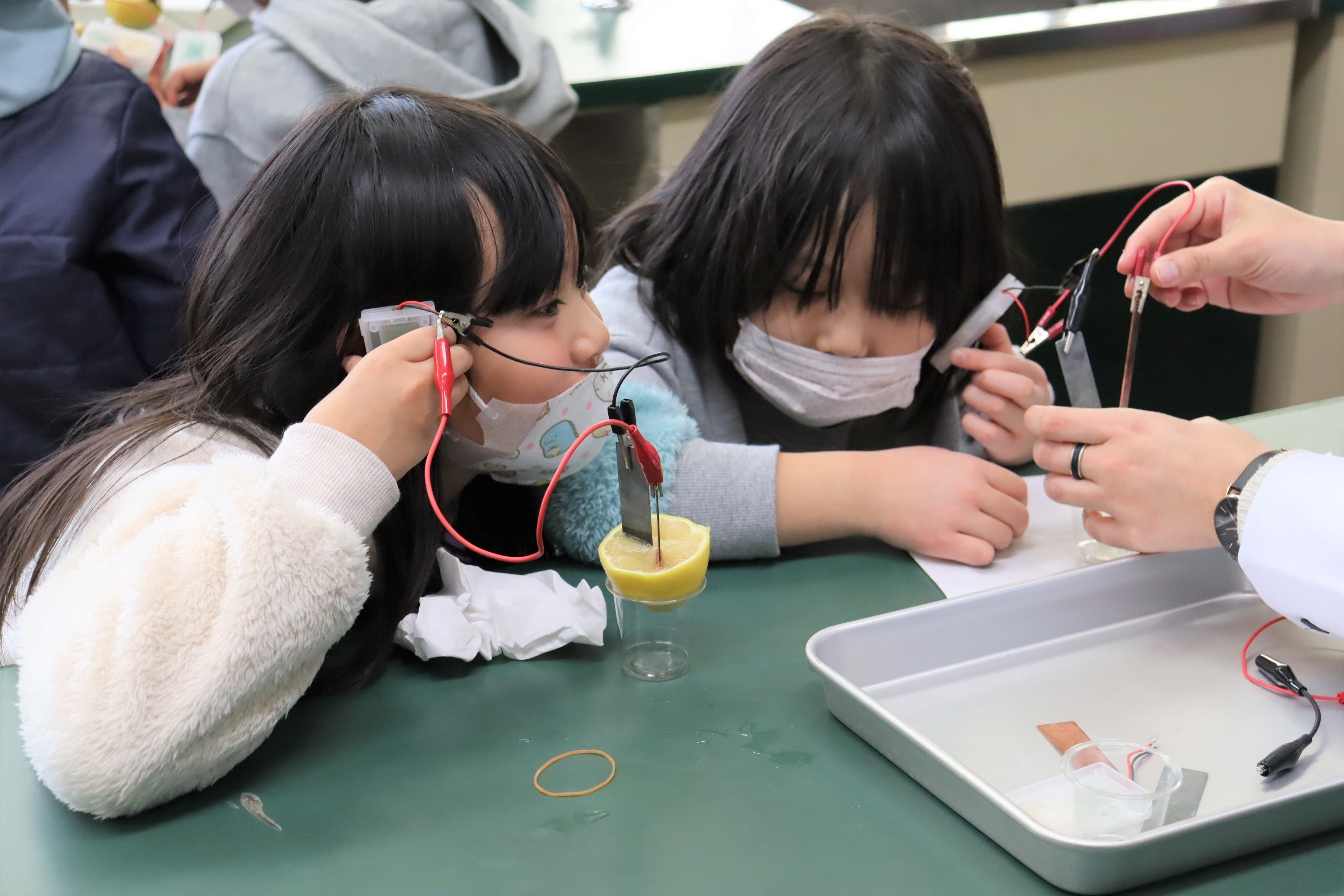 児童たちは、2種類の金属板にメロディアンをつなぎ、金属板をレモンに差し込むことによってエネルギーが発生して音が流れるか確認します。実験に苦戦する子もいましたが、髙村教授のゼミに所属する学生の方々が机を周りサポートしてくださいました。自分のレモンにつないだメロディアンから無事に音が流れると、児童たちから「聴こえた!」と歓声が上がります。