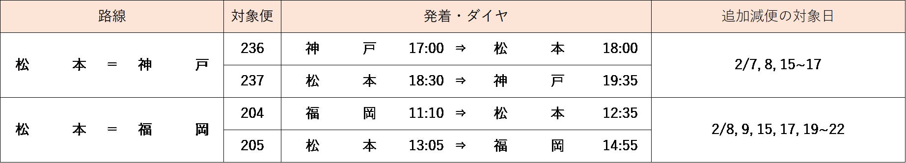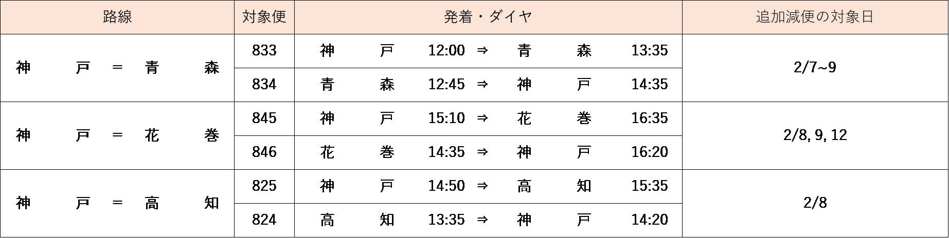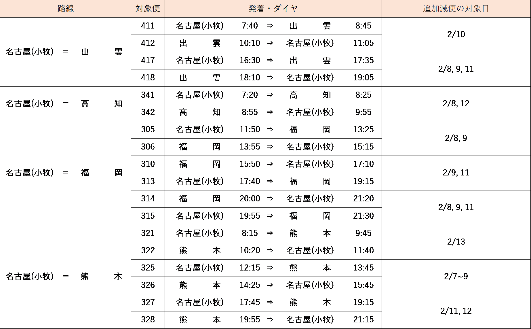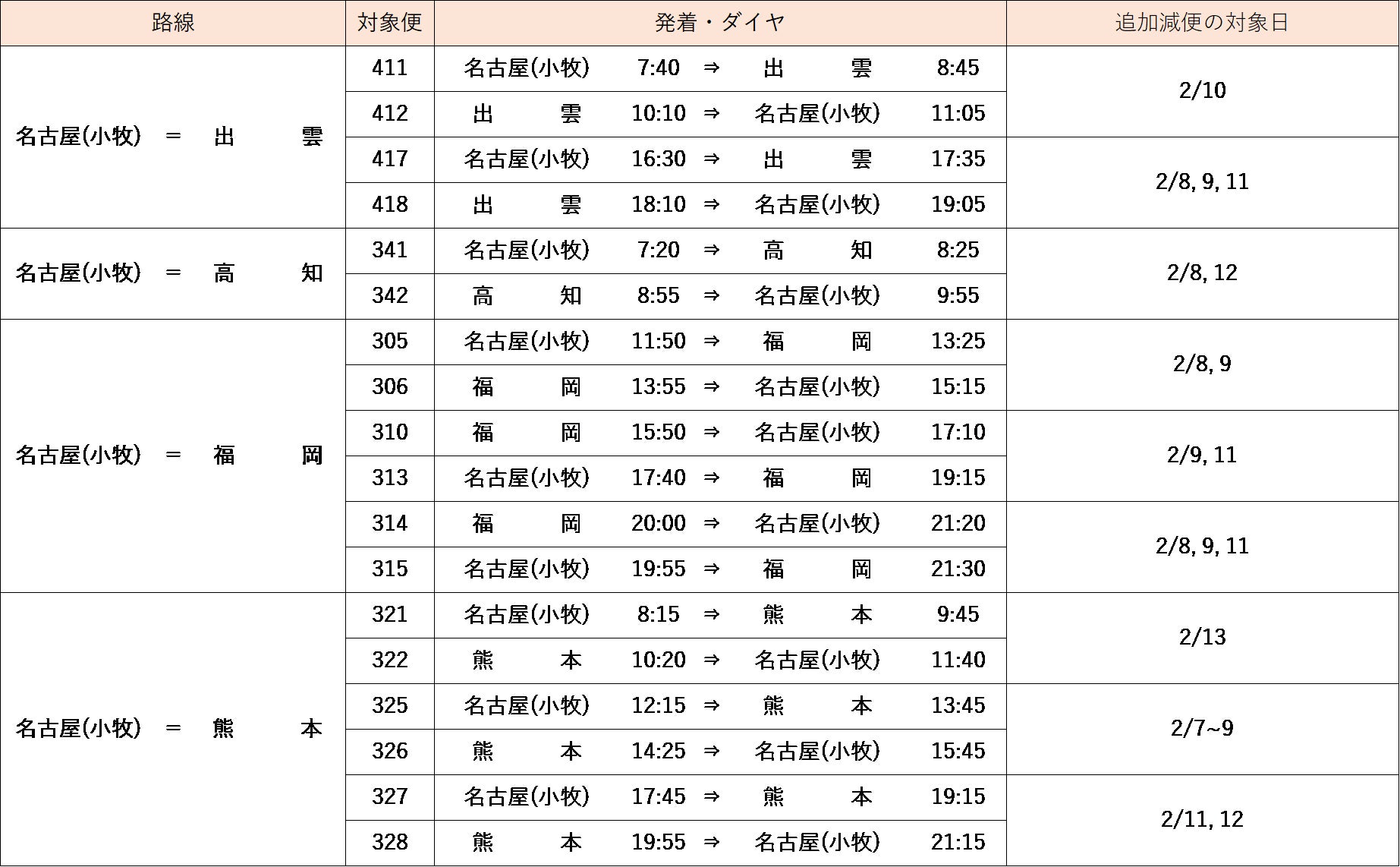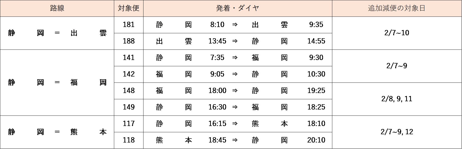 株式会社フジドリームエアラインズ(略称:FDA、本社:静岡県静岡市、代表取締役社長:楠瀬 俊一)は、新型コロナウイルス感染症の影響による航空需要の減少に伴い2月7日(月)~22日(火)の期間、以下のとおり追加減便を決定いたしました。