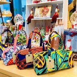 ※アフリカの布で製作した衣類やバッグ、小物の他、現地から仕入れた食品や雑貨を販売。