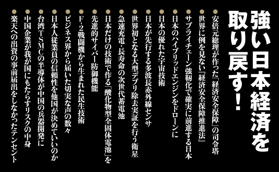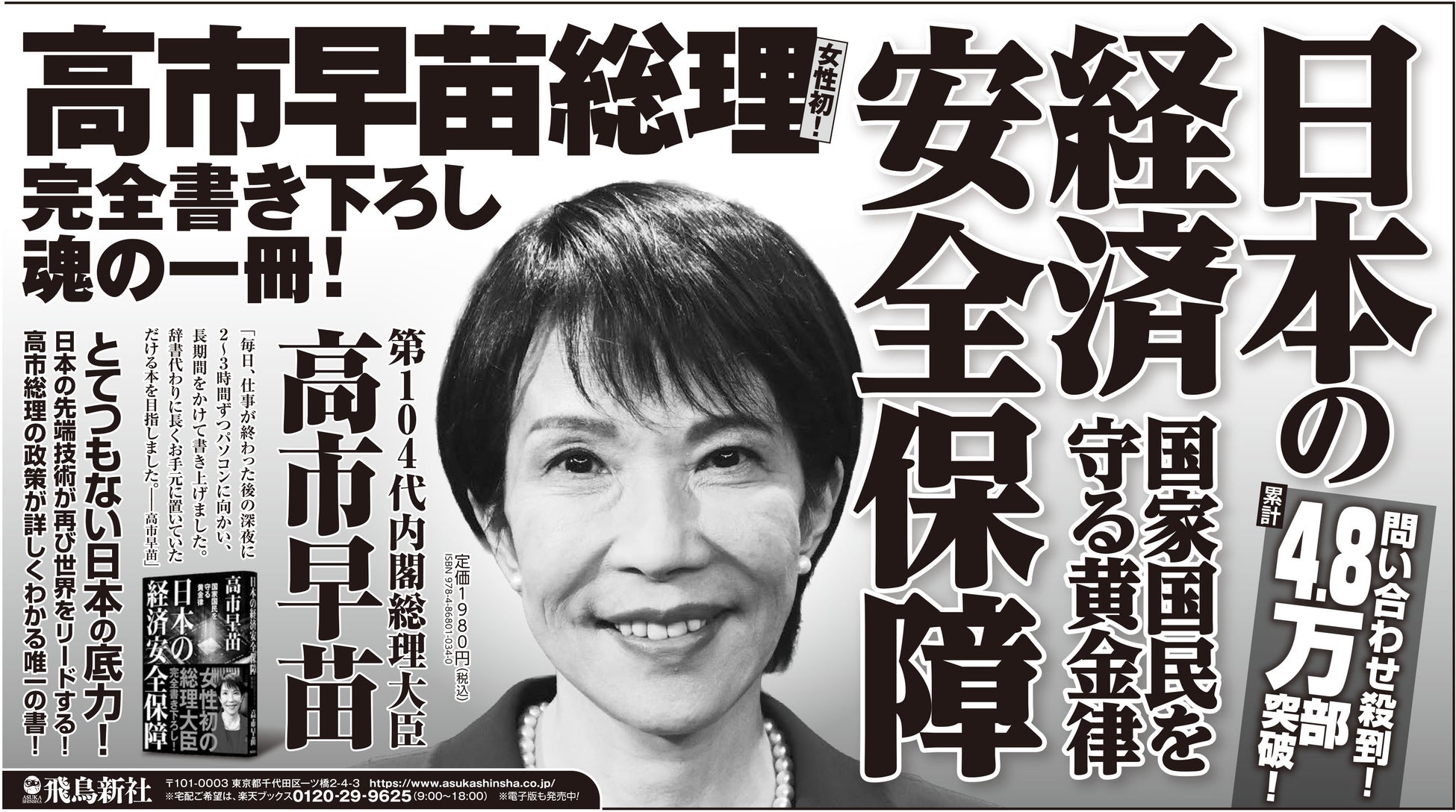 株式会社飛鳥新社(本社:東京都千代田区、代表取締役社長:土井尚久)より2024年7月8日、安倍晋三元総理の御命日に発売となった『日本の経済安全保障~国家国民を守る黄金律』が全国の書店で売れており、問い合わせ殺到につき7刷目の重版が決まりました。累計5.3万部を突破。高市早苗総理が経済安全保障担当大臣時代に徹夜で書き下ろした渾身の一冊。高市総理の政策が詳しくわかる唯一の本として話題です。