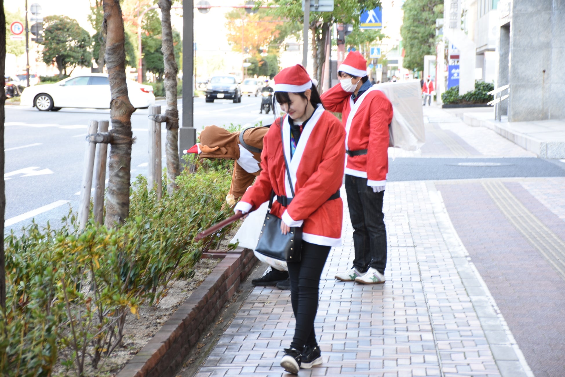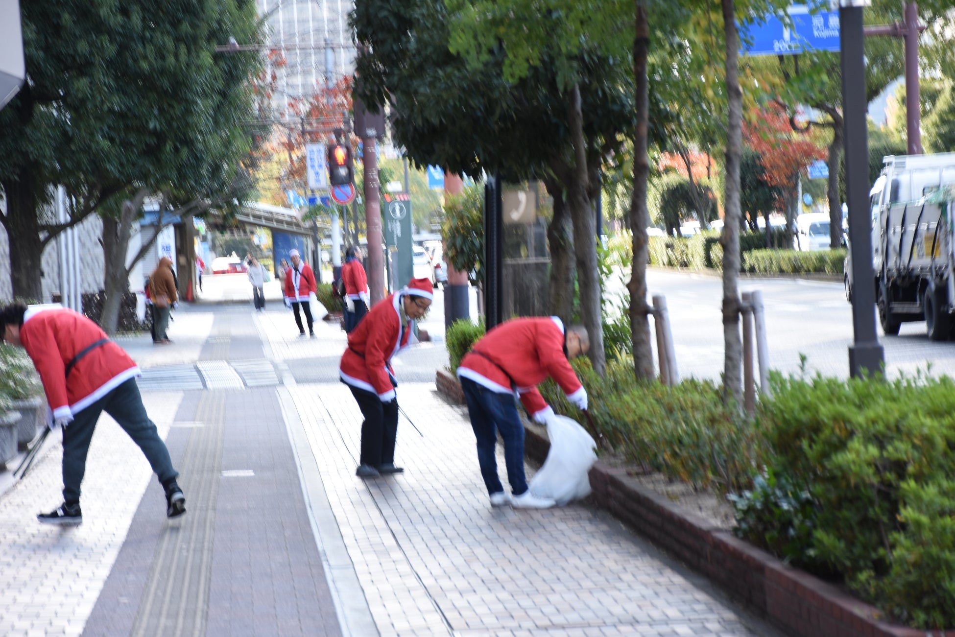 今年は趣旨に賛同してくださった岡山ガス株式会社(所在地:岡山市中区桜橋、代表取締役社長:岡﨑達也)のみなさんも初めて参加してくださり、総勢170人の「おそうじサンタ」が集結。参加者全員がサンタクロースやトナカイの衣装をまとい、約1時間、ごみ袋を片手に落ち葉や、たばこの吸い殻、空き缶、ペットボトルなどのゴミを拾いながら街を歩きました。