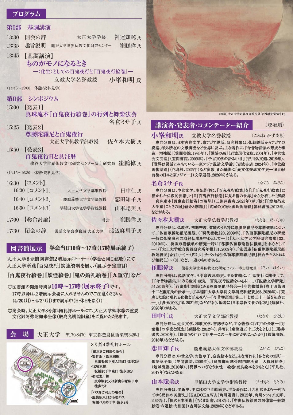 当日は、「百鬼夜行説話」に焦点を当て、仏教説話やアジアの説話などについて研究されている著名な小峯和明氏(立教大学名誉教授)をはじめ、尊勝陀羅尼の専門家である佐々木大樹氏(大正大学仏教学部教授)、百鬼夜行説話の専門の崔鵬偉氏(龍谷大学世界仏教文化研究センター博士研究員)、百鬼夜行のご著書のある名倉ミサ子氏、その他、近世文学の田中仁氏(大正大学文学部准教授)、中世文学の恋田知子氏(慶應義塾大学文学部教授)、美術史の山本聡美氏(早稲田大学文学学術院教授)などといった関連する諸学の専門家が結集し、多角的な視点から、講演・シンポジウムを開催します。ぜひ、ご来場ください。