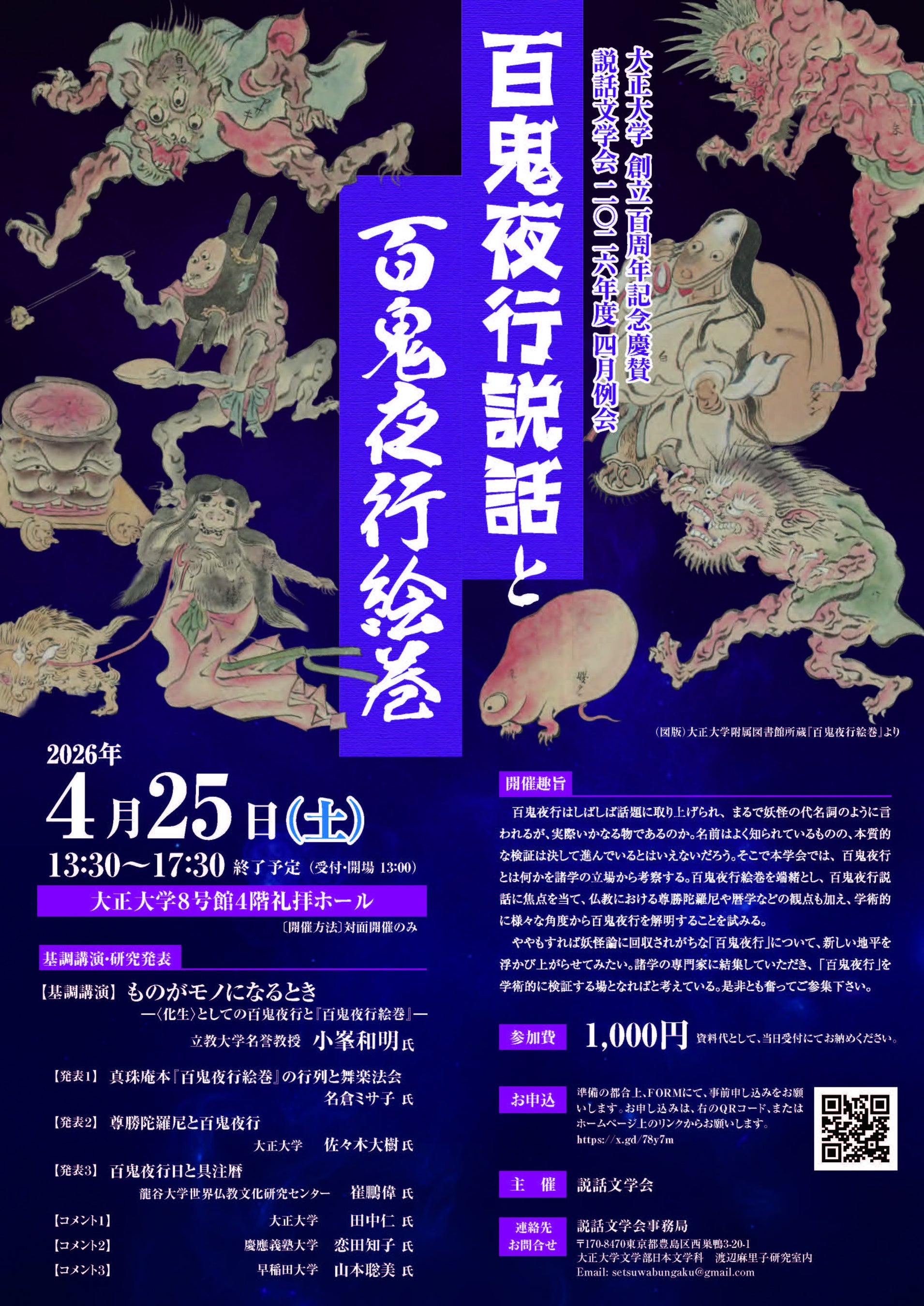 大正大学(学長:神達知純、所在地:東京都豊島区)は、2026年4月25日(土)に大正大学創立百周年記念慶賛、説話文学会2026年度4月例会として「百鬼夜行説話と百鬼夜行絵巻」を開催します。