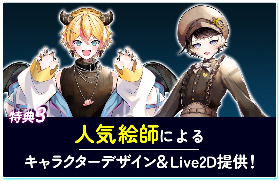 また、人気イラストレーターによる合格者の希望に沿ったオリジナルキャラクターデザイン、活動用機材の提供、最大収容人数3,000人を超える会場での出演などVSingerとして華々しくデビューしていただけます。