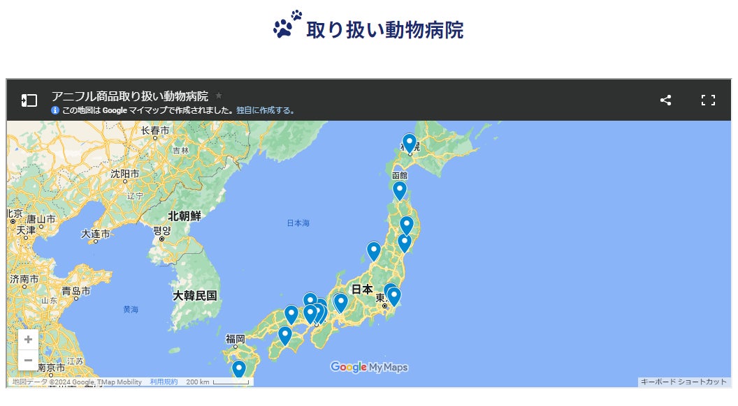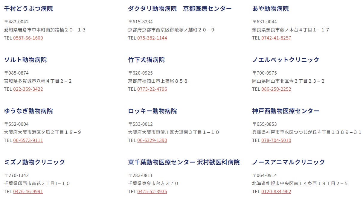 本サイトから、anifullの製品を取り扱っている全国の動物病院を調べることが可能になりました。(現在19院掲載 ※2024.12.3時点)取り扱いのある動物病院では、anifullの製品のご相談・ご注文が可能です。