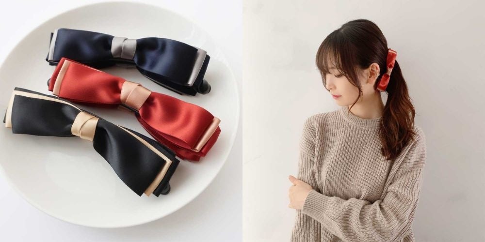 リボンというフェミニンなモチーフでありながらも、サテンの素材感が大人っぽさを演出してくれます。