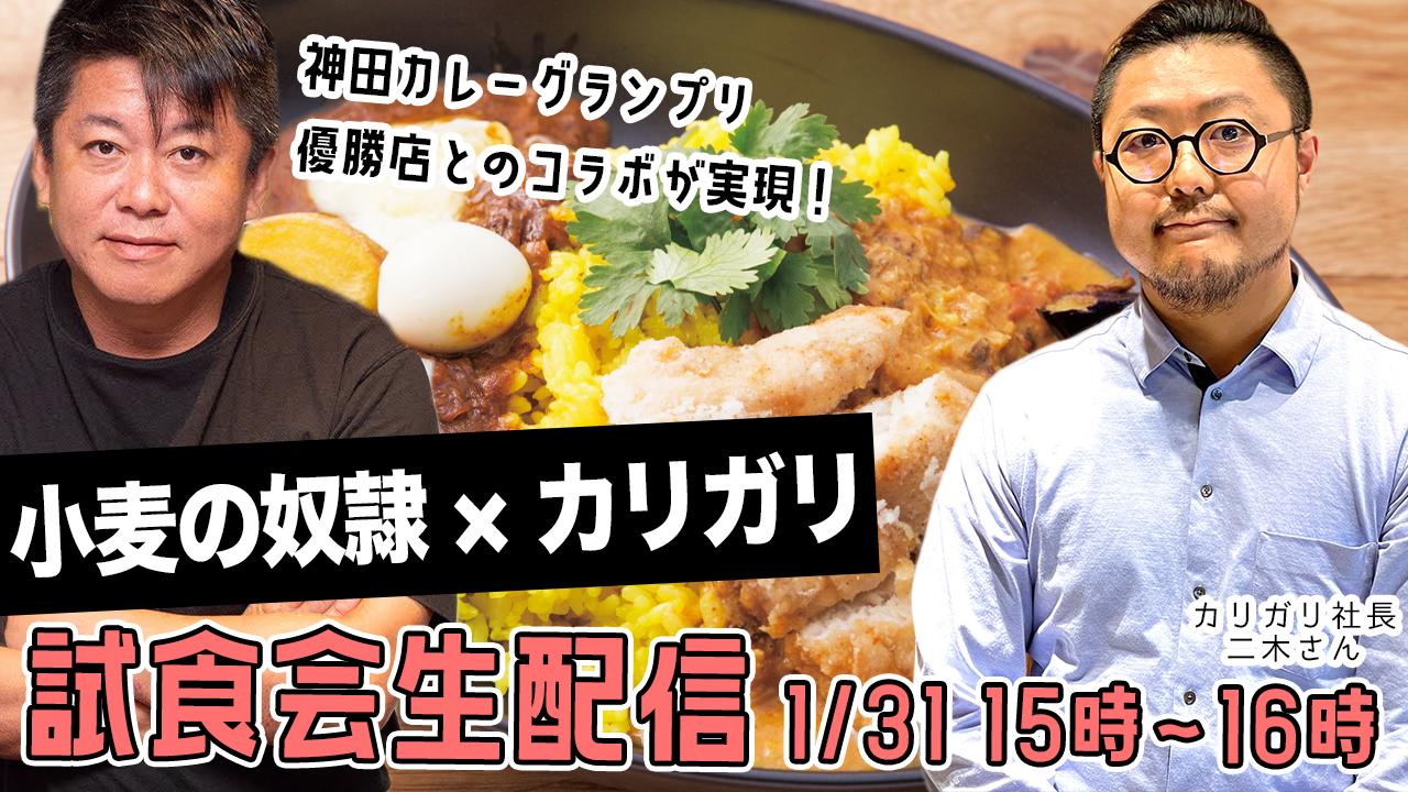 この度、新商品となるカリガリカレーが監修したカレーとのコラボパン試食会を1月31日(月)YouTube【ホリエモンチャンネル】にてライブ配信します。