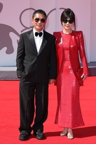 生涯功労賞にあたる金獅子賞を授賞した日本でも人気の高い香港の俳優、Tony Leung Chiu-wai が授賞式の際に着用したのは、ジョルジオ アルマーニのメイド トゥ メジャーのタキシード、彼の妻で女優の Carina Lau を伴い颯爽と登場しました。彼女が選んだのは全面に施された深紅のシークインが眩いジョルジオ アルマーニ プリヴェのドレスです。