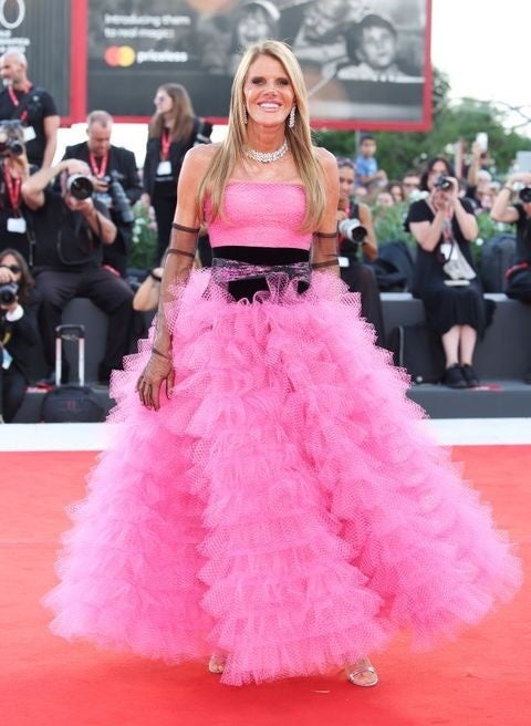 VOGUE USAのAnna Wintour編集長と並び、ファッションアイコンとして注目される過去にVOGUE JAPANのファッションディレクターを務めたAnna Dello Russoはピンクのカラーとラッフルのスカートがアイキャッチ―なジョルジオ アルマーニ プリヴェのドレスを彼女らしくコケティッシュに着こなしました。