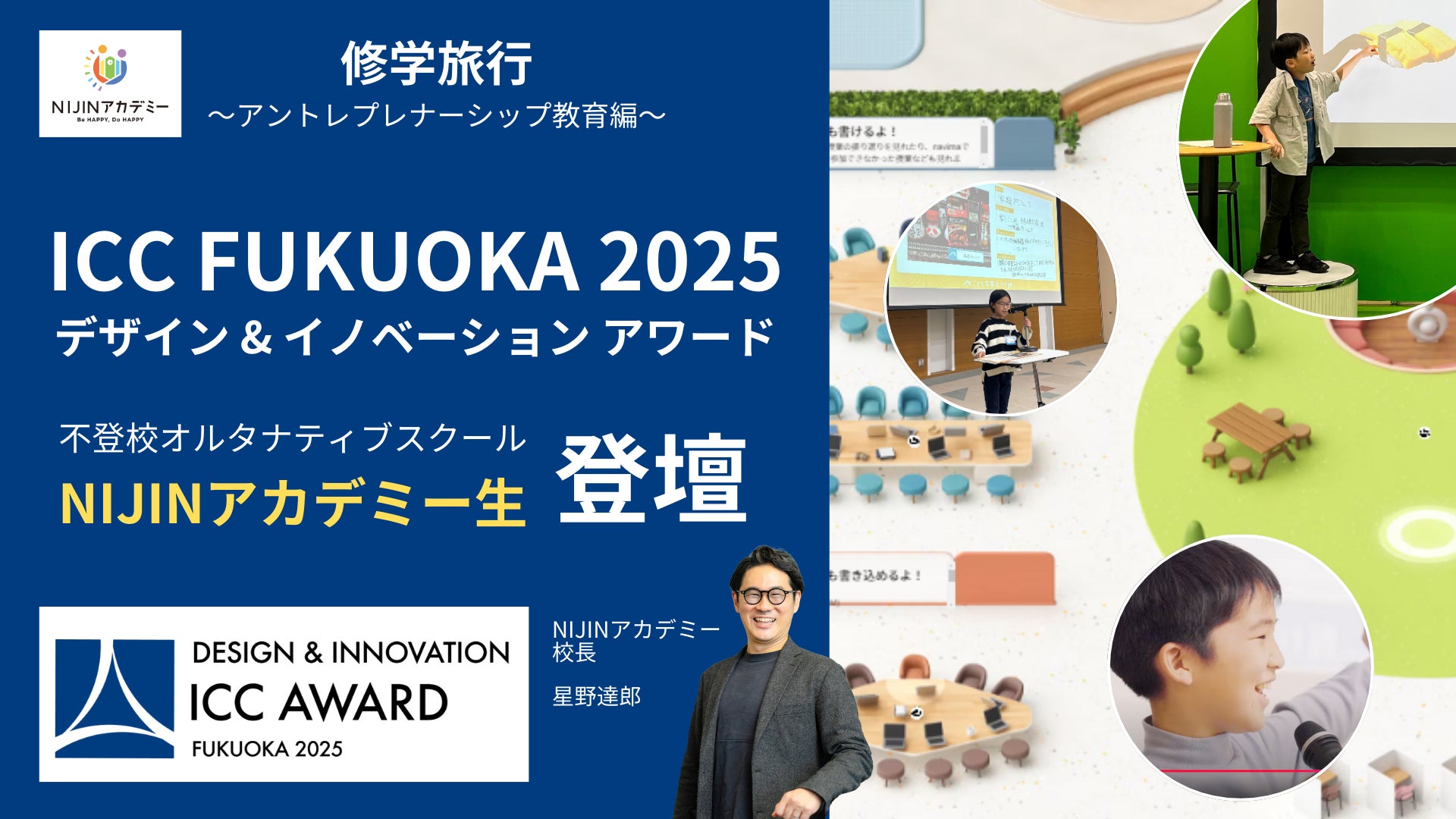 株式会社NIJIN(本社:東京都江東区、代表取締役:星野達郎)が運営する不登校オルタナティブスクール『NIJINアカデミー』が、2025年2月17日(月)~2月20日(木)に行われる「ICC FUKUOKA 2025 デザイン & イノベーション アワード」に登壇する修学旅行~アントレプレナーシップ教育編~の実施が決定したことをお知らせします。