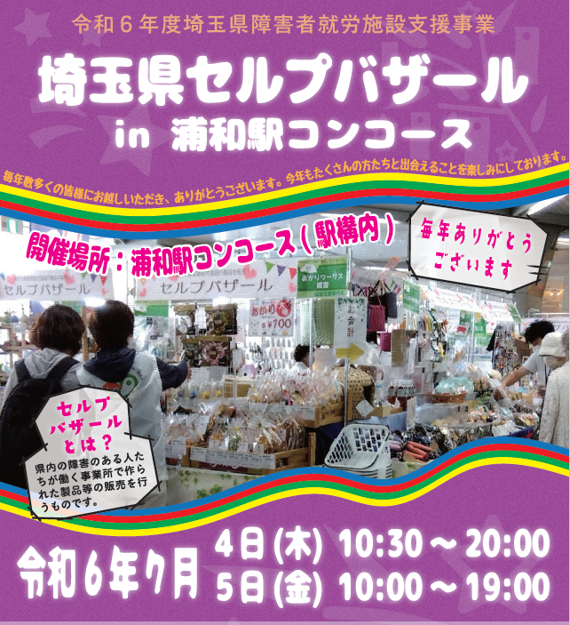 県内の就労継続支援B型事業所等で構成する「埼玉県セルプセンター協議会」が、今年も「セルプバザールin浦和駅コンコース」を開催します。