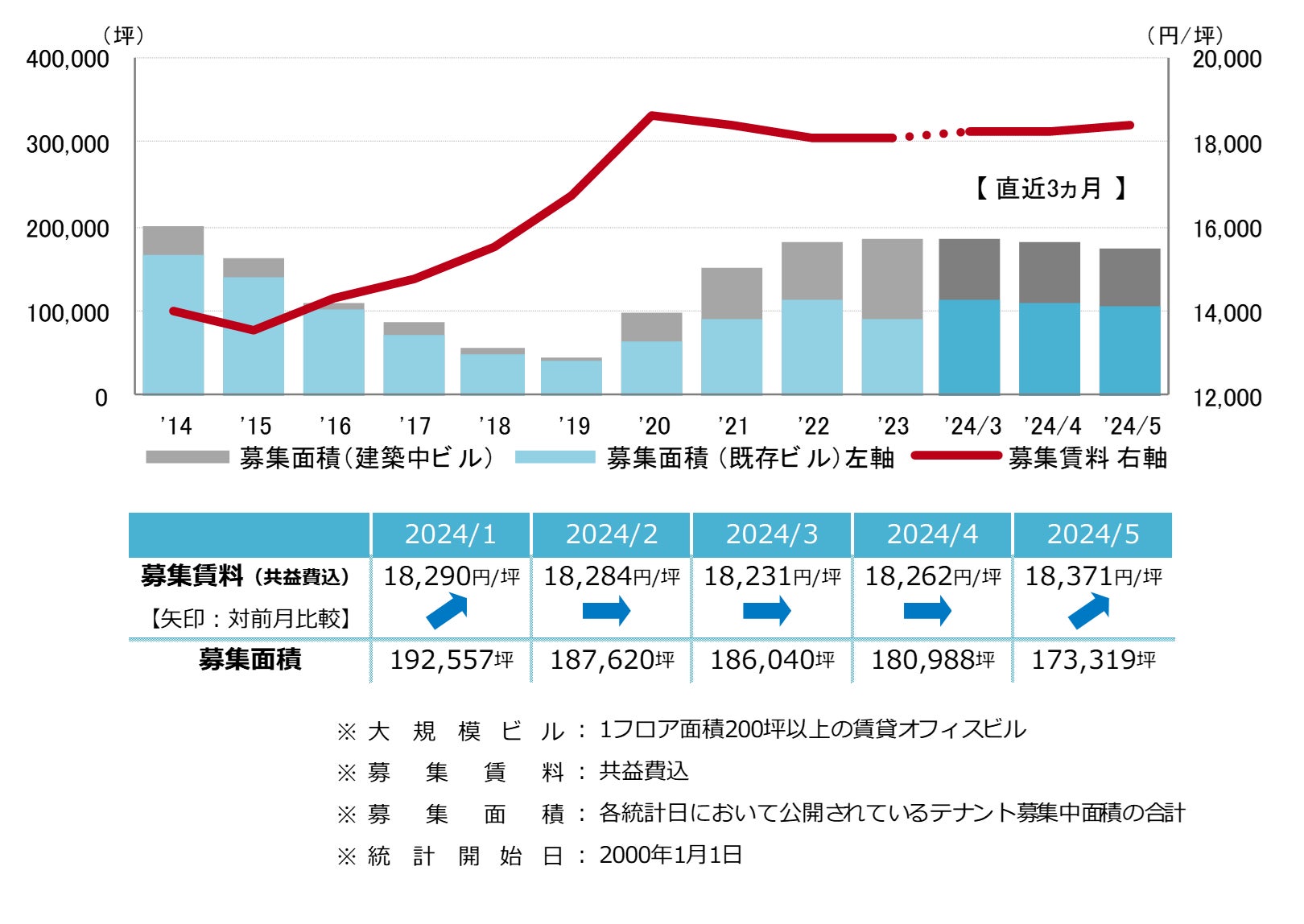 募集賃料は前月比プラス109円/坪の18,371円/坪となった。前月から小幅に上昇したものの、募集賃料は18,000円/坪台前半での横ばい傾向が継続している。