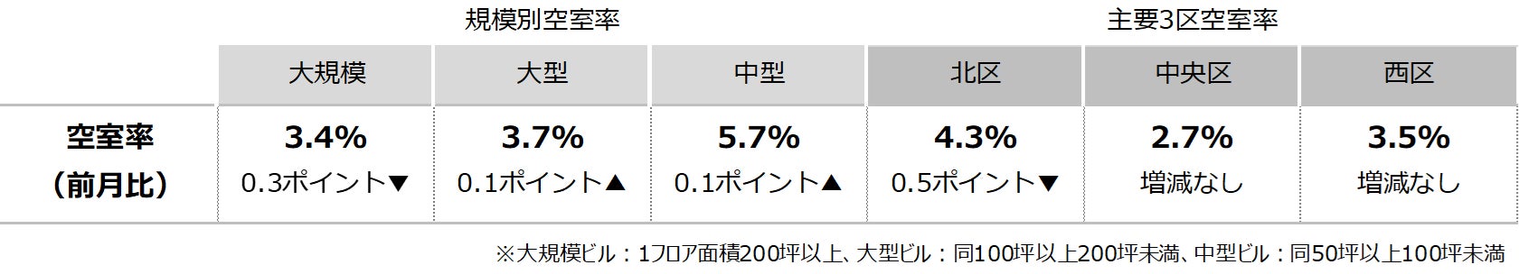 空室率は前月比マイナス0.26ポイントの3.44%となり、前月から低下した。ビルグレード改善を目的とした移転等により新築・築浅ビルを中心に空室消化が進み、主な低下要因となっている。エリア別では「北区」が前月比マイナス0.5ポイントの大幅な低下となった。潜在空室率は前月比マイナス0.36ポイントの5.29%だった。