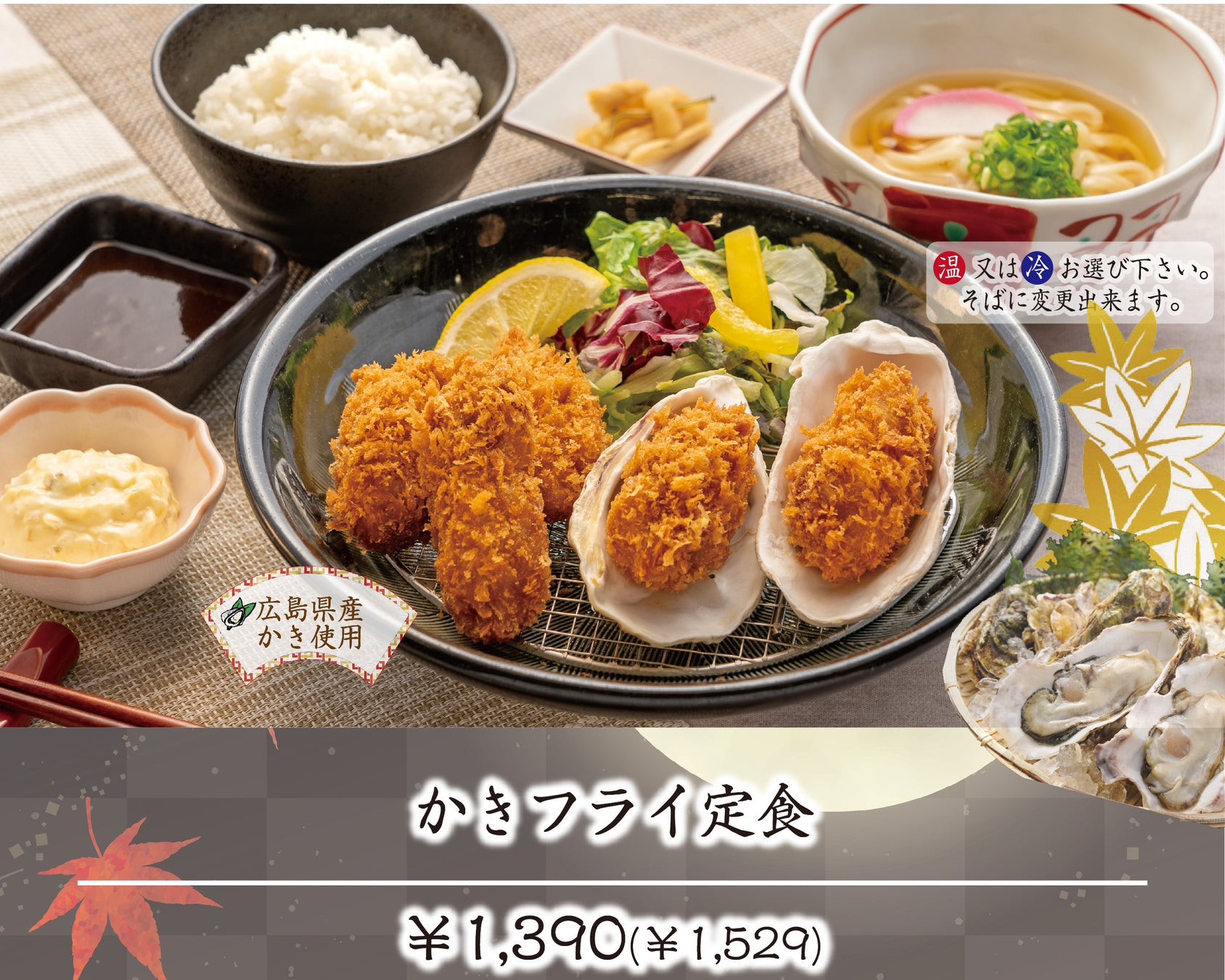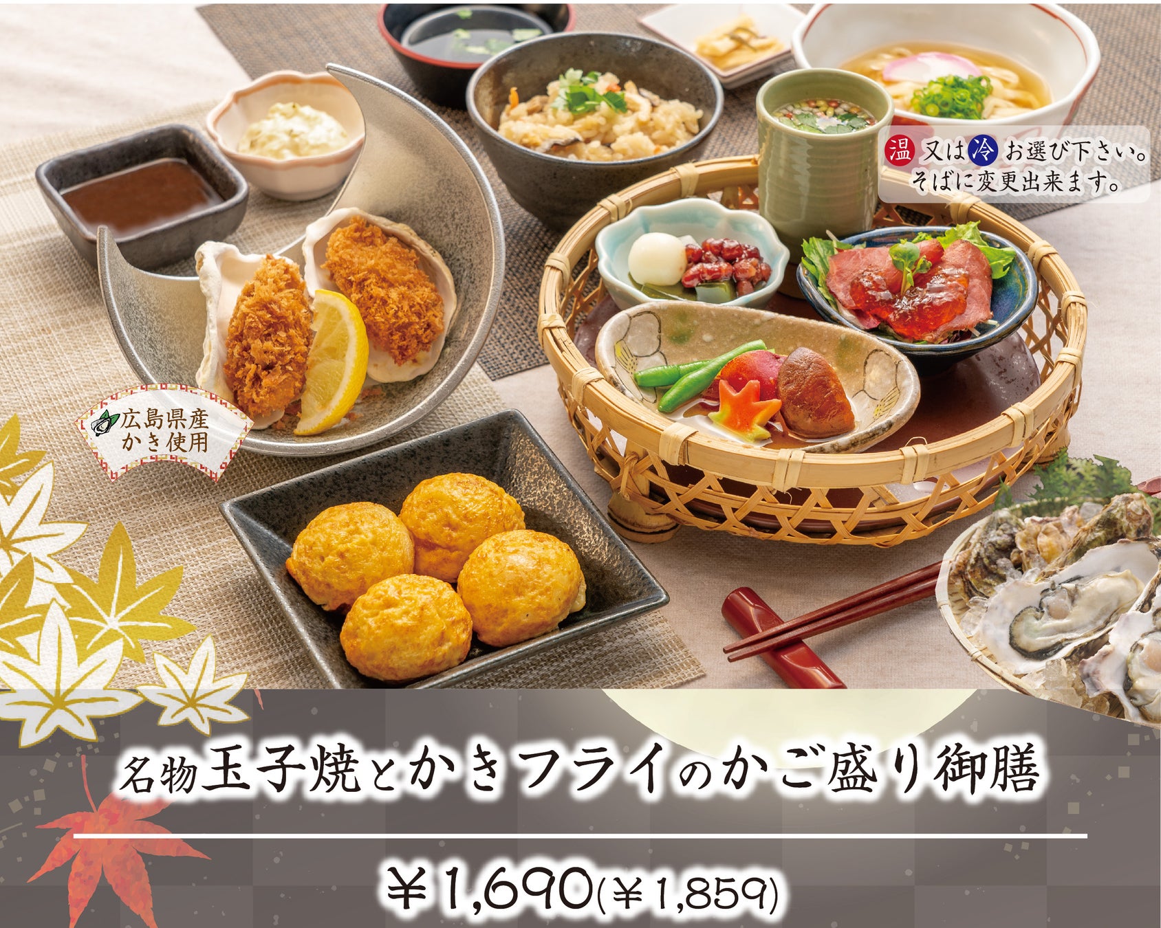 旬の味覚を楽しめるかきフライ定食や名物玉子焼とかきフライのかご盛り御膳も好評発売中!