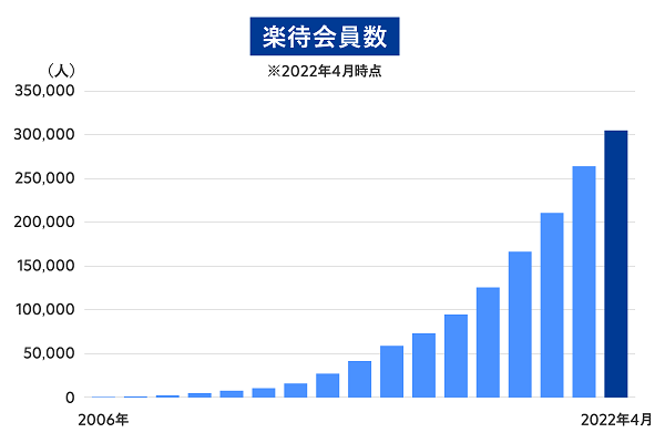 不動産投資ポータルサイト「楽待」は2006年3月に開設し、2017年10月に会員数10万人、2年半後の2020年3月に20万人を突破し、そして更に2年1カ月後、2022年4月で会員登録数30万人という規模にまで成長しました。