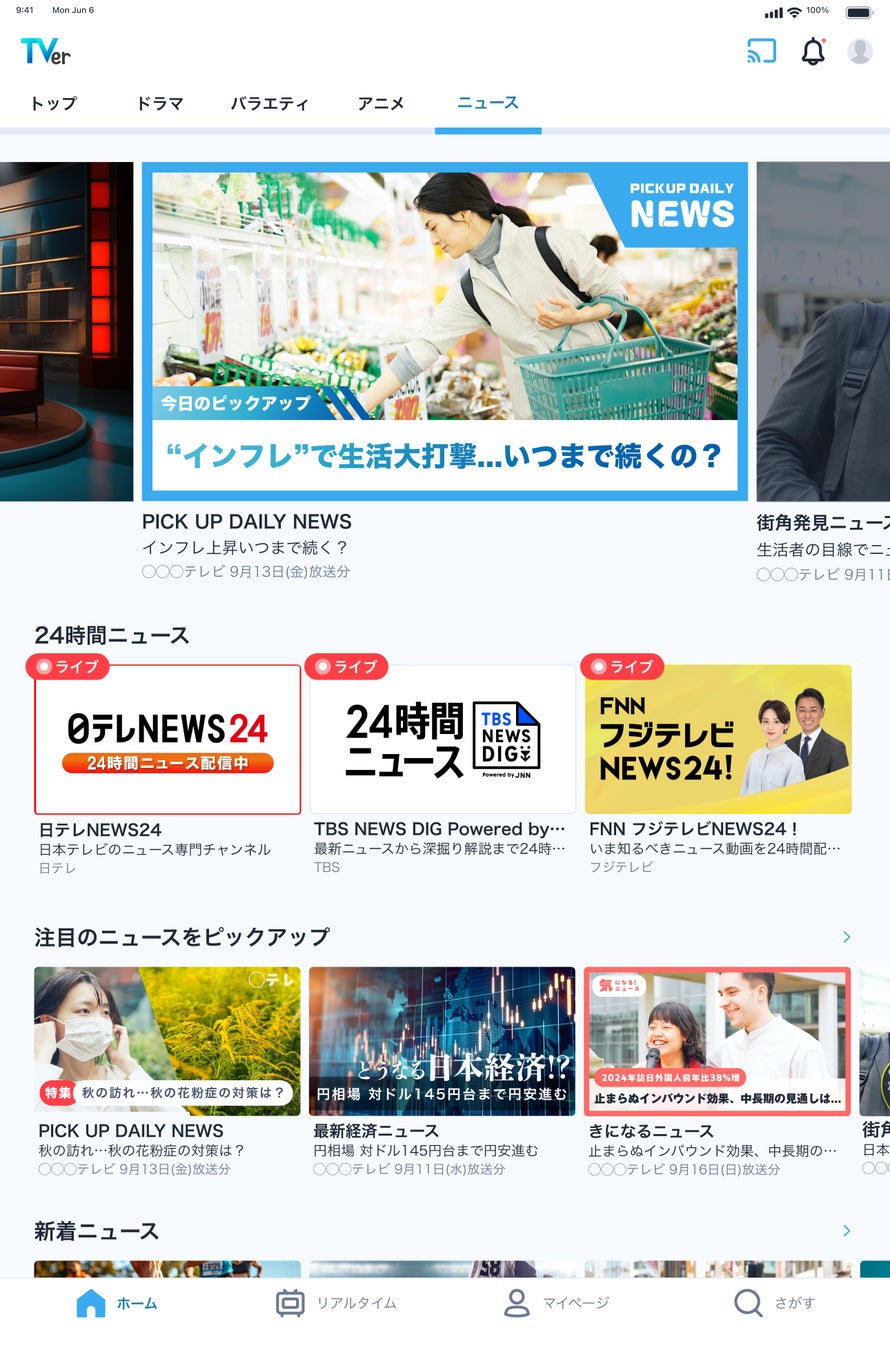 TVerホーム画面内に「ニュース」カテゴリタブを新設し、報道・情報コンテンツを強化