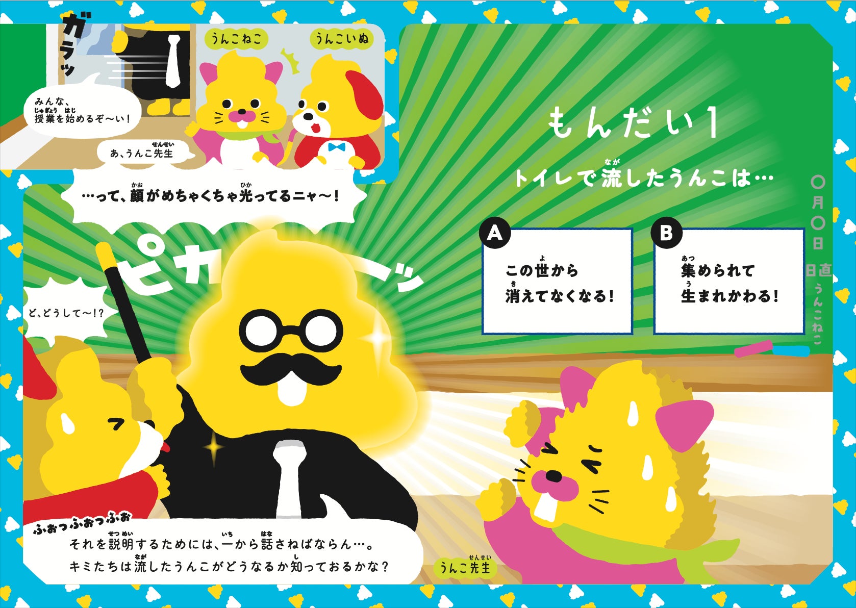 冊子は、うんこドリルシリーズでおなじみのキャラクター・うんこ先生にうんこねことうんこいぬが、「トイレで流したうんこはどこへ行くのか?」と問いを出される場面からはじまります。