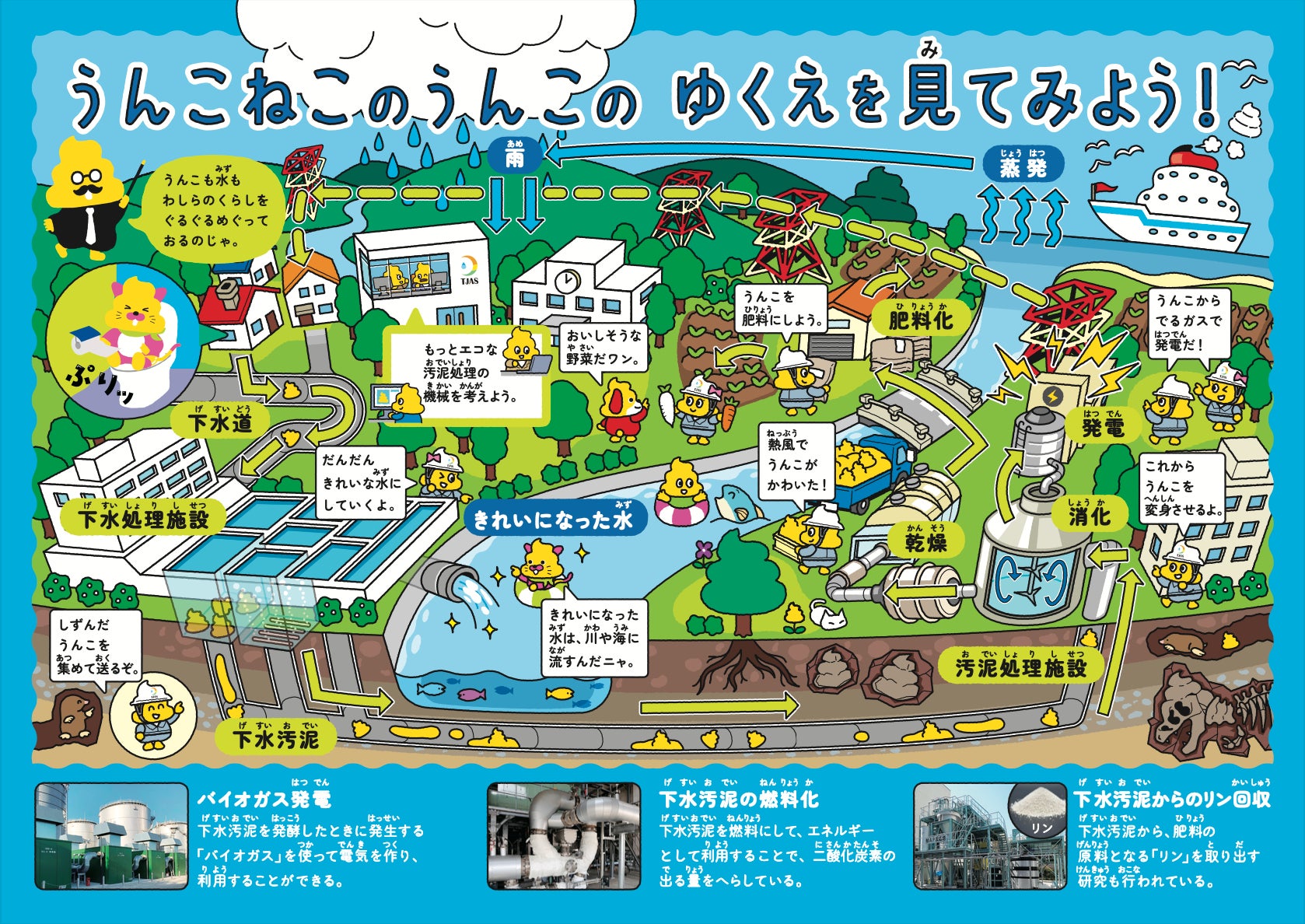 うんこ(下水汚泥)が燃料・肥料・建材などへと生まれ変わり、循環型社会の一翼を担っていることを、クイズや解説を通じてわかりやすく紹介しています。