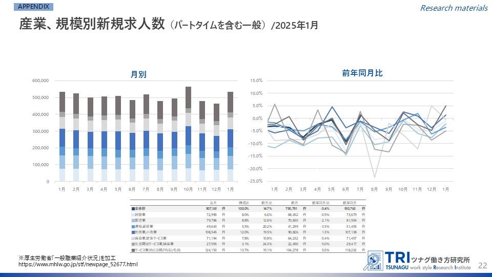 株式会社ツナググループ・ホールディングス(本社:東京都中央区、代表取締役社長:米田 光宏)を母体とする、多様な働き方の調査研究機関「ツナグ働き方研究所(拠点:東京都中央区、所長:大野 博司)」は、官公庁などが発表する労働市場関連のデータをキュレーションしつつ、分かりやすくまとめた「労働市場データレポート」を毎月発表しています。今回は3月上旬に発表された最新データをもとに2025年1月度のレポートについて、とりまとめましたのでご報告いたします。