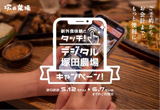 公式サイトならびにアプリからのご予約でお会計が10%オフになる「タッチ!デジタル塚田農場キャンペーン」を2022年5月12日(木)~2022年6月7日(火)の期間で実施いたしますので、予約・店舗での注文・会計の一連をDXでスムーズに繋ぐ“デジタル塚田農場”で、新しい外食を体験してください。