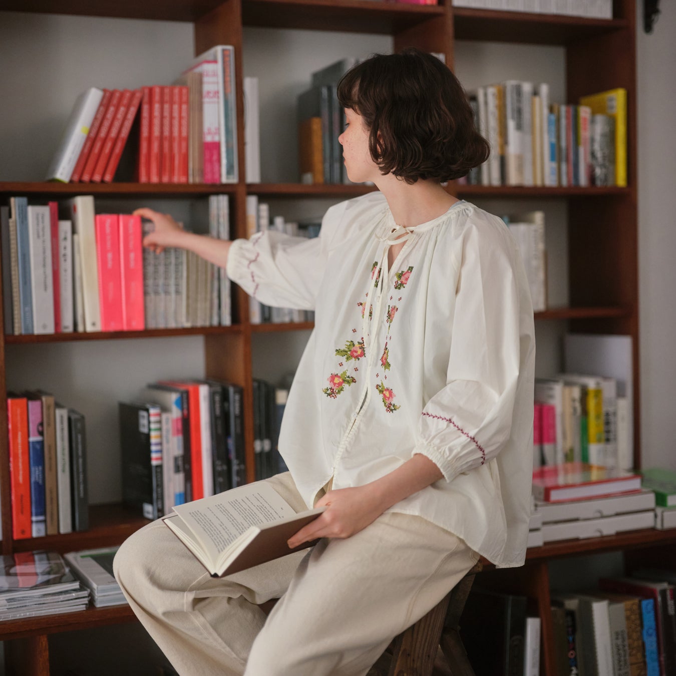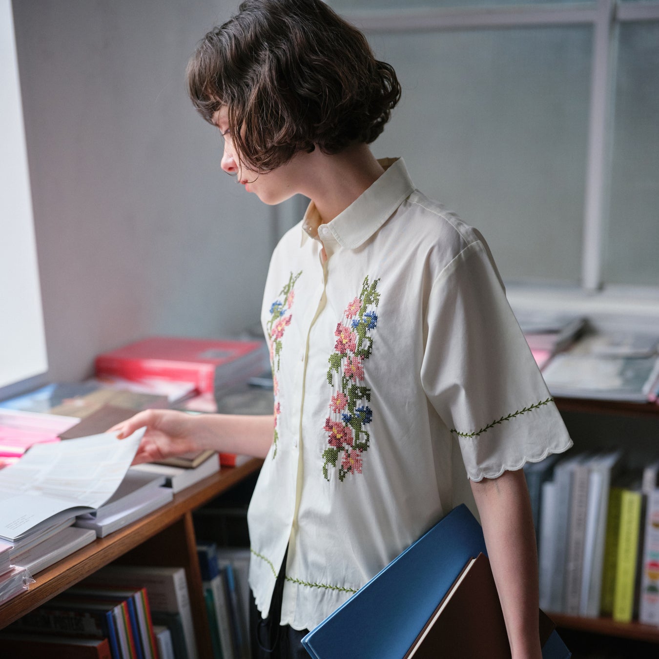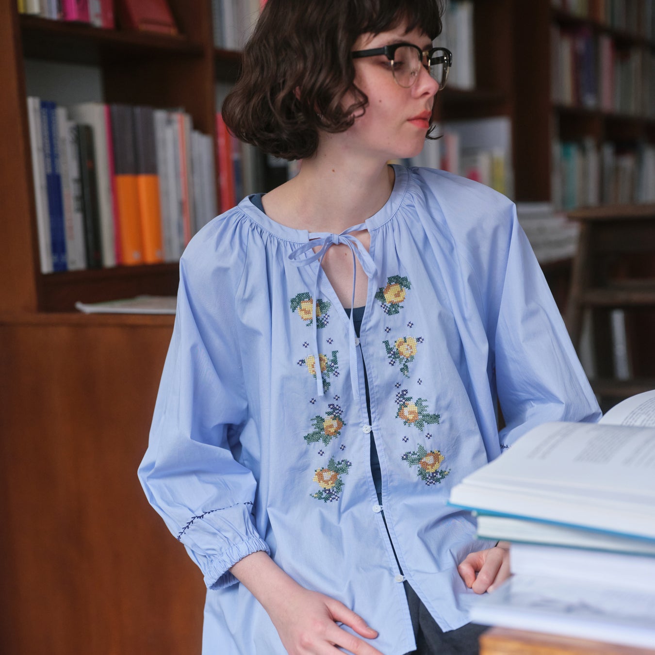 本コレクションでは、アーカイブから厳選した図案を、クロスステッチ風の刺繍で表現をしたリボン付きギャザーブラウスやフレアスカートなどをラインアップしております。やわらかな色彩と立体感のある刺繍が魅力のアイテムを通して、日常のスタイリングに自然に溶け込むSAJOUの世界観を取り入れたコーディネイトをご提案いたします。