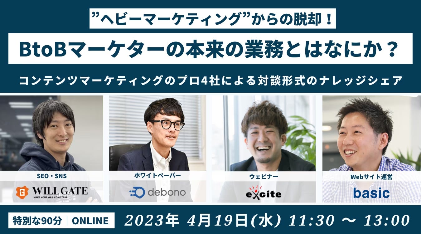 内容 | “ヘビーマーケティング”からの脱却!BtoBマーケターの本来の業務とはなにか? ・BtoBマーケティングにおけるコンテンツのあり方について ・コンテンツ作成のポイント (対談|株式会社ウィルゲート 吉岡氏 ×株式会社デボノ 後藤田氏) ・コンテンツ配信の効率化 (対談|エキサイト株式会社 大熊氏 × 当社 林) ・4社によるフリートーク |
