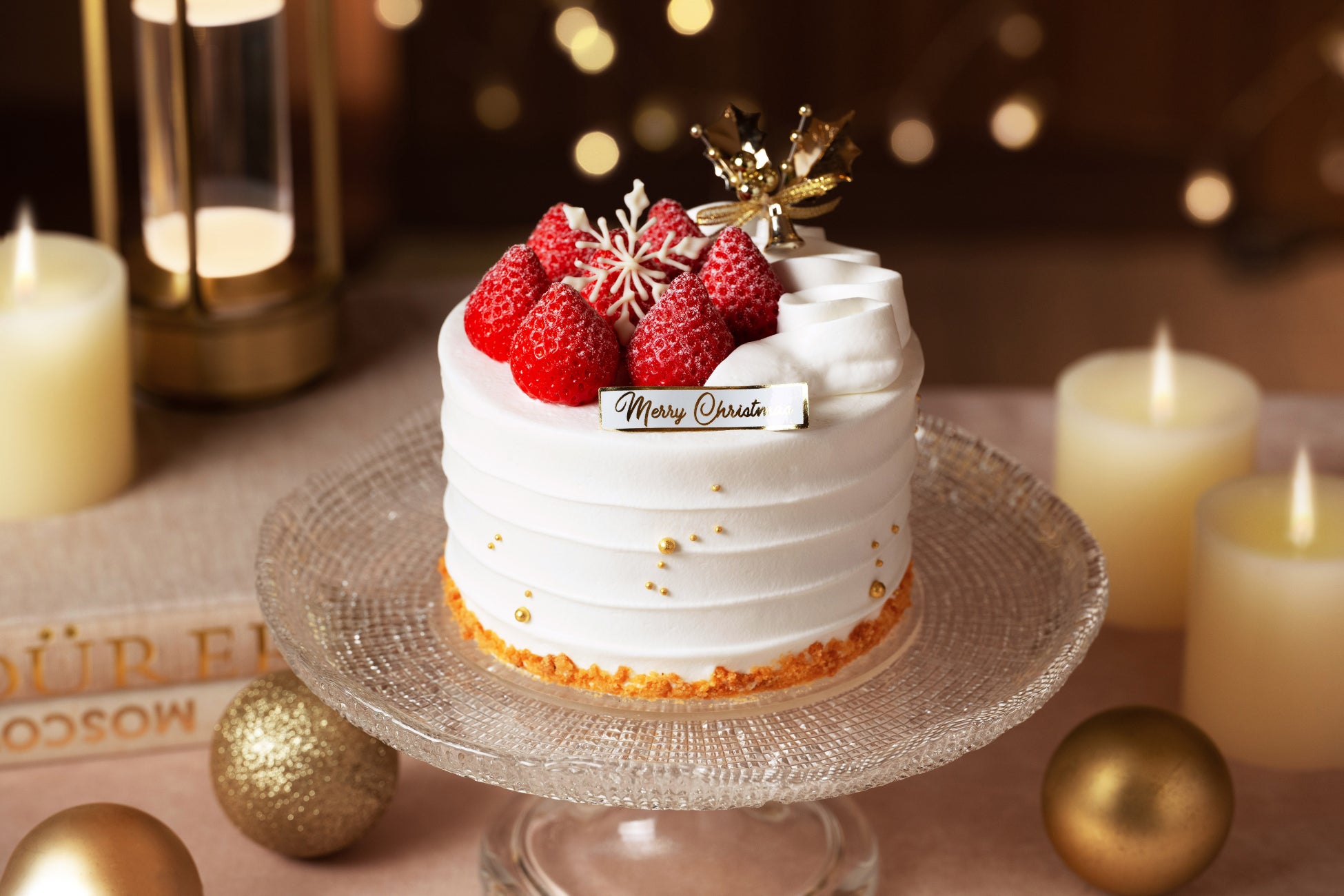 [ 商品紹介 ]:贅沢に使用した苺と優しい甘さの生クリームを合わせた、華やかな王道のショートケーキです。結婚式で多くのお客様に愛されてきたレシピを基に、ふんわりとしたスポンジと口どけの軽やかなクリームで仕上げました。トップには雪の結晶をかたどった繊細なチョコレートをあしらい、側面にはゴールドのアクセントを添えて、聖夜にふさわしい華やかさをプラス。ウェディングパティシエが手がけるからこそ生まれた、シンプルでありながら上品な“記念日の一台”です。