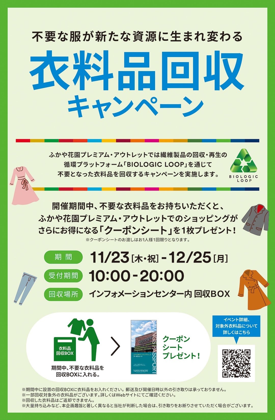 今回、ふかや花園プレミアム・アウトレットでは、施設内インフォメーションセンターにBIOLOGIC LOOPの回収ボックスを設置し、アウトレットを訪れるお客様から衣料品等を回収します。また、期間中、不要な衣料品をお持ち込み頂いた方に、当施設でのお買い物がお得に楽しめるクーポンシートを1枚プレゼントします(お一人様1回限り)。本格的な寒さを迎える前の冬支度に、使わなくなったコートやセーターなど冬物衣料のリサイクルにもなり、ご来場のお客様が誰でも気軽に、不要な衣料品を廃棄せず循環させるアクションに参加できます。