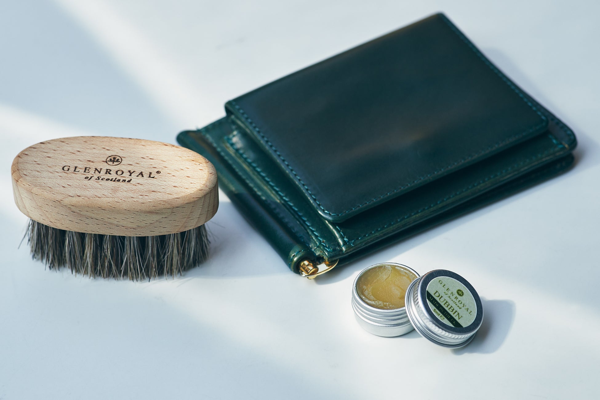 グレンロイヤル純正「ブラシ S」とブライドルレザー専用ワックス「ダビン」のミニサイズ。