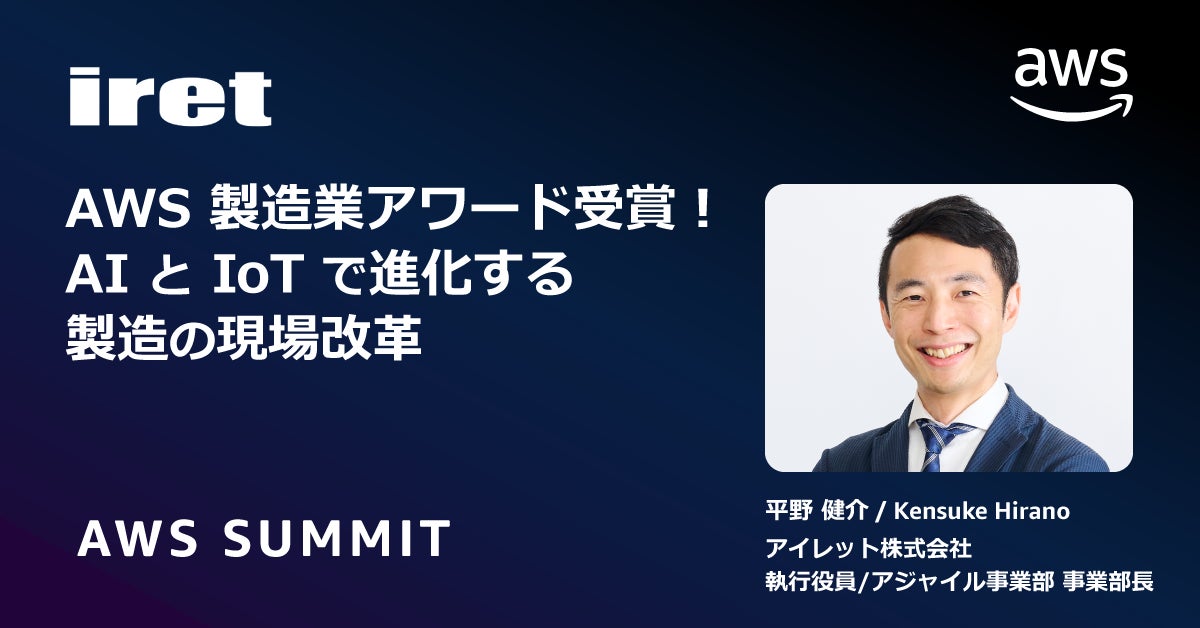 システム・アプリケーションの開発、グラフィック・UI/UX デザイン制作からインフラの構築・運用までをワンストップで提供するアイレット株式会社(本社:東京都港区、代表取締役社長:岩永充正、以下 アイレット)は、2025年6月25日(水)・26日(木)に幕張メッセにて開催される日本最大のアマゾン ウェブ サービス(以下 AWS)を学ぶイベント「AWS Summit Japan 2025」に Diamond スポンサーとして協賛することを発表します。6月25日(水)のセッションでは、執行役員 平野 健介が登壇し、AWS の製造業アワード2024を受賞した自動車・製造業界の AI と IoT を活用した先進的な取り組みについてご紹介します。
