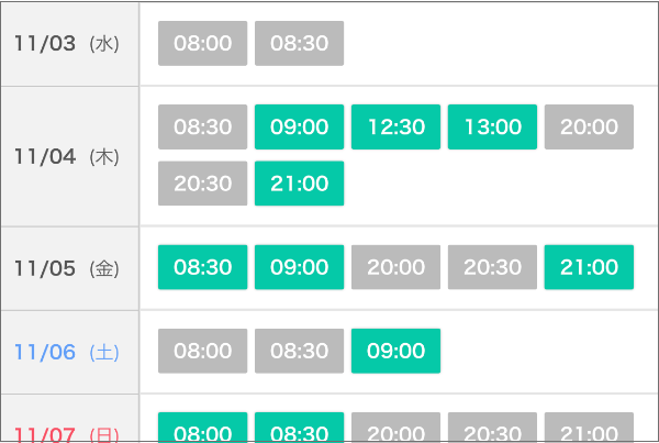 2. 講師の詳細ページにある「講師スケジュール」に表示されている「緑のボタン」の時間から、ご希望の日時を選んで予約する