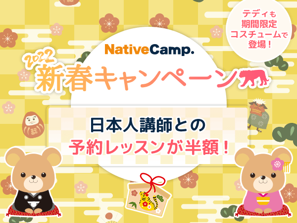 【英会話レッスン回数無制限】ネイティブキャンプ 2022年新春キャンペーン!日本人講師の予約レッスンが毎日半額!さらにキャラクター先生 Teddyも期間限定コスチュームでレッスンを提供